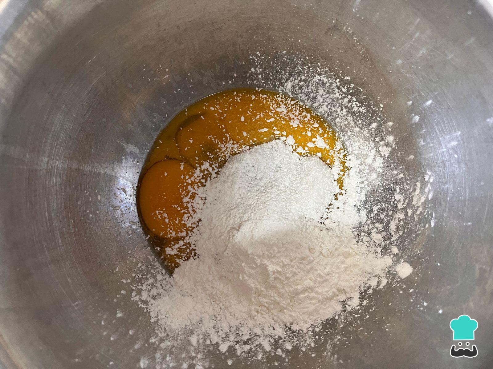 Agrega en un bol las yemas de huevo, la mitad del azúcar, maicena y harina de trigo.