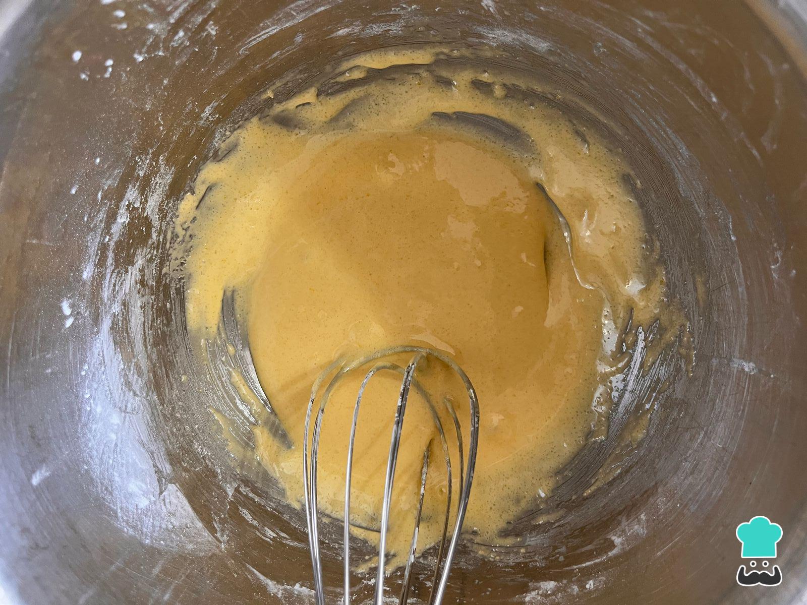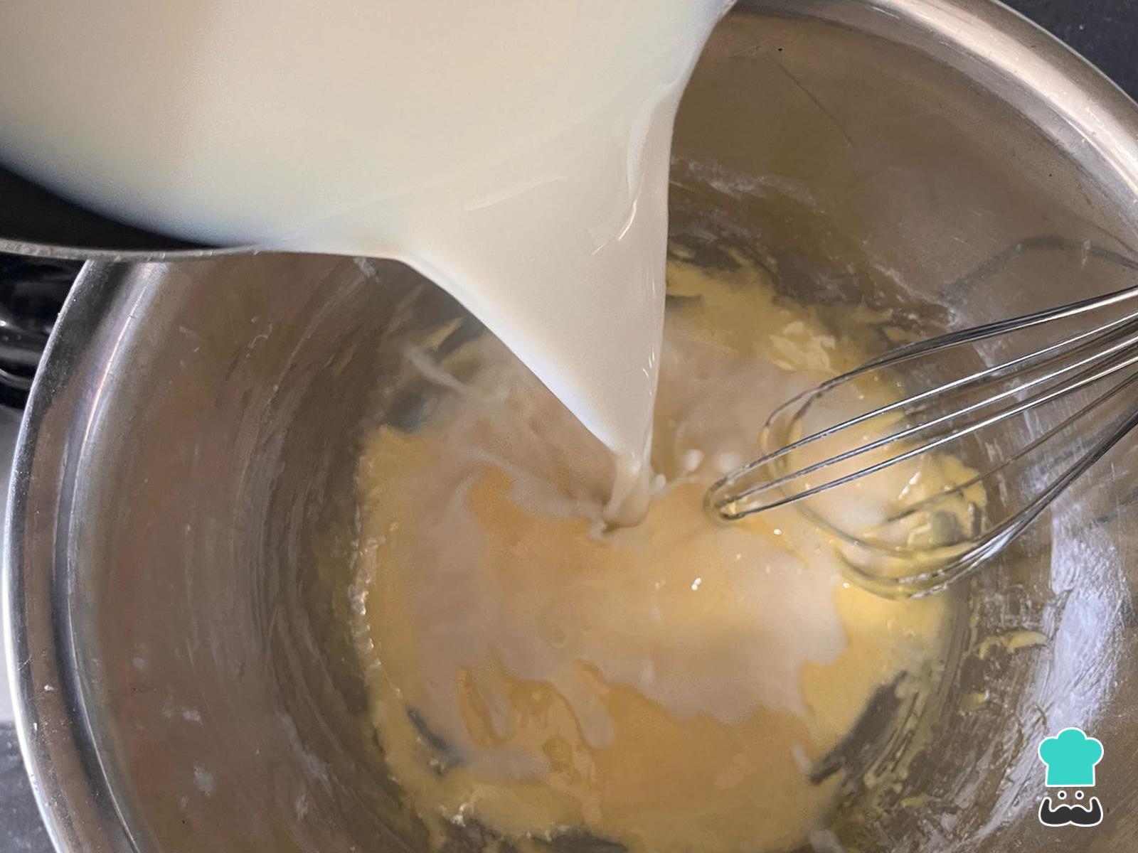 Cuando esté caliente, vierte una parte de la leche en la mezcla de las yemas e integra bien. Luego, vierte la leche restante.