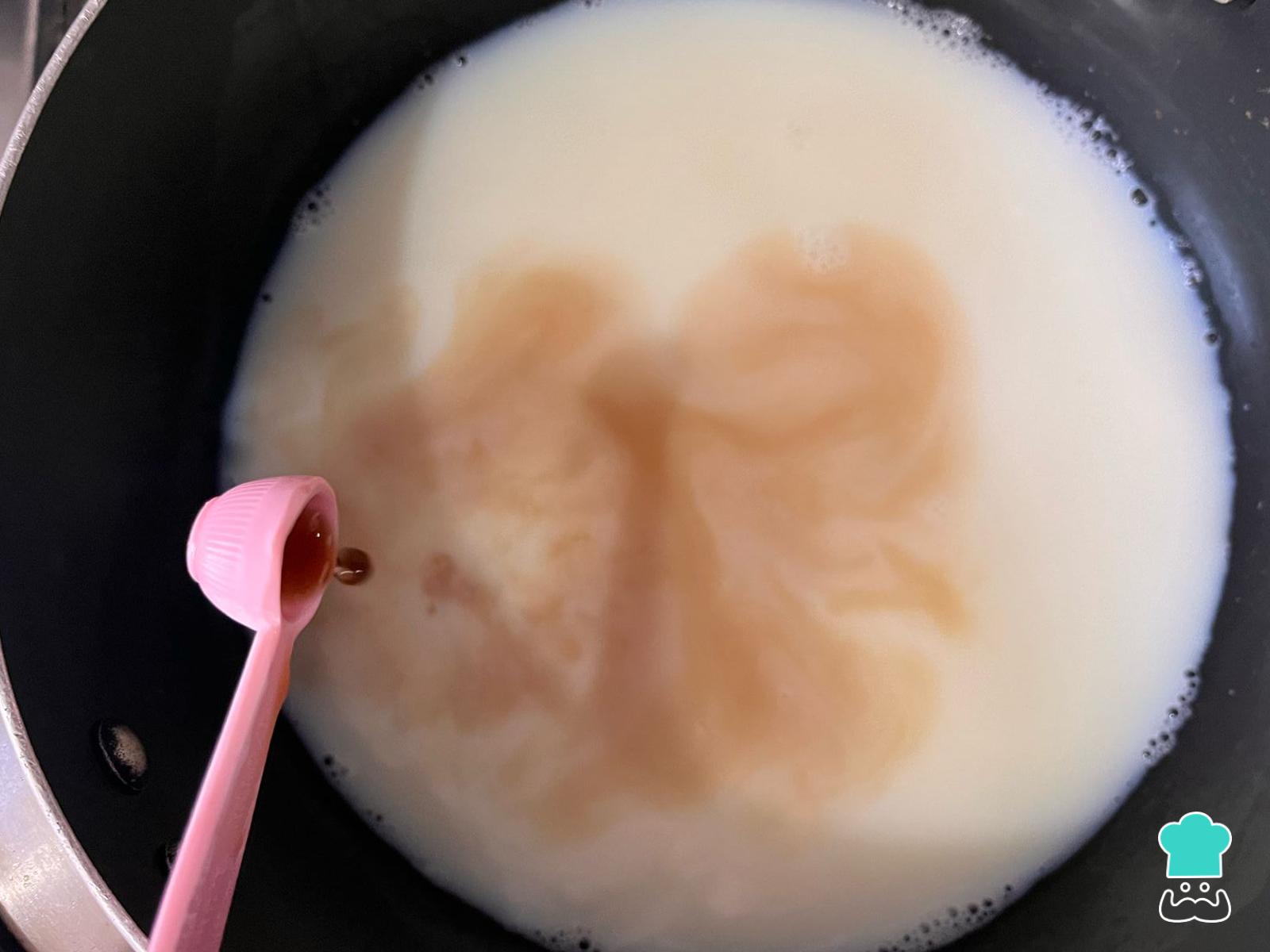 Agrega la esencia de vainilla y la leche líquida, mezcla.