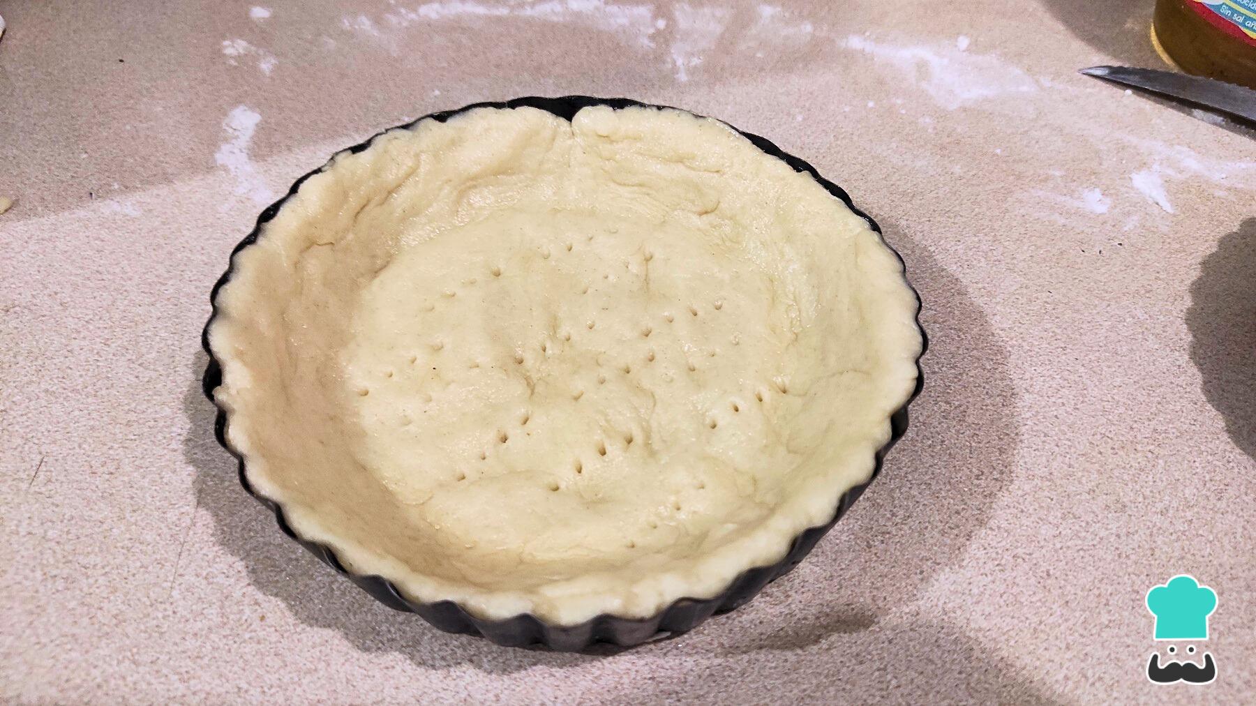 Cubre con la masa la superficie de un molde para tarta de 20 a 24 centímetros, previamente aceitado, con la masa y pincha su superficie con un tenedor. Hornea a 180°C con calor arriba y abajo por 10 minutos para precocinar la base.