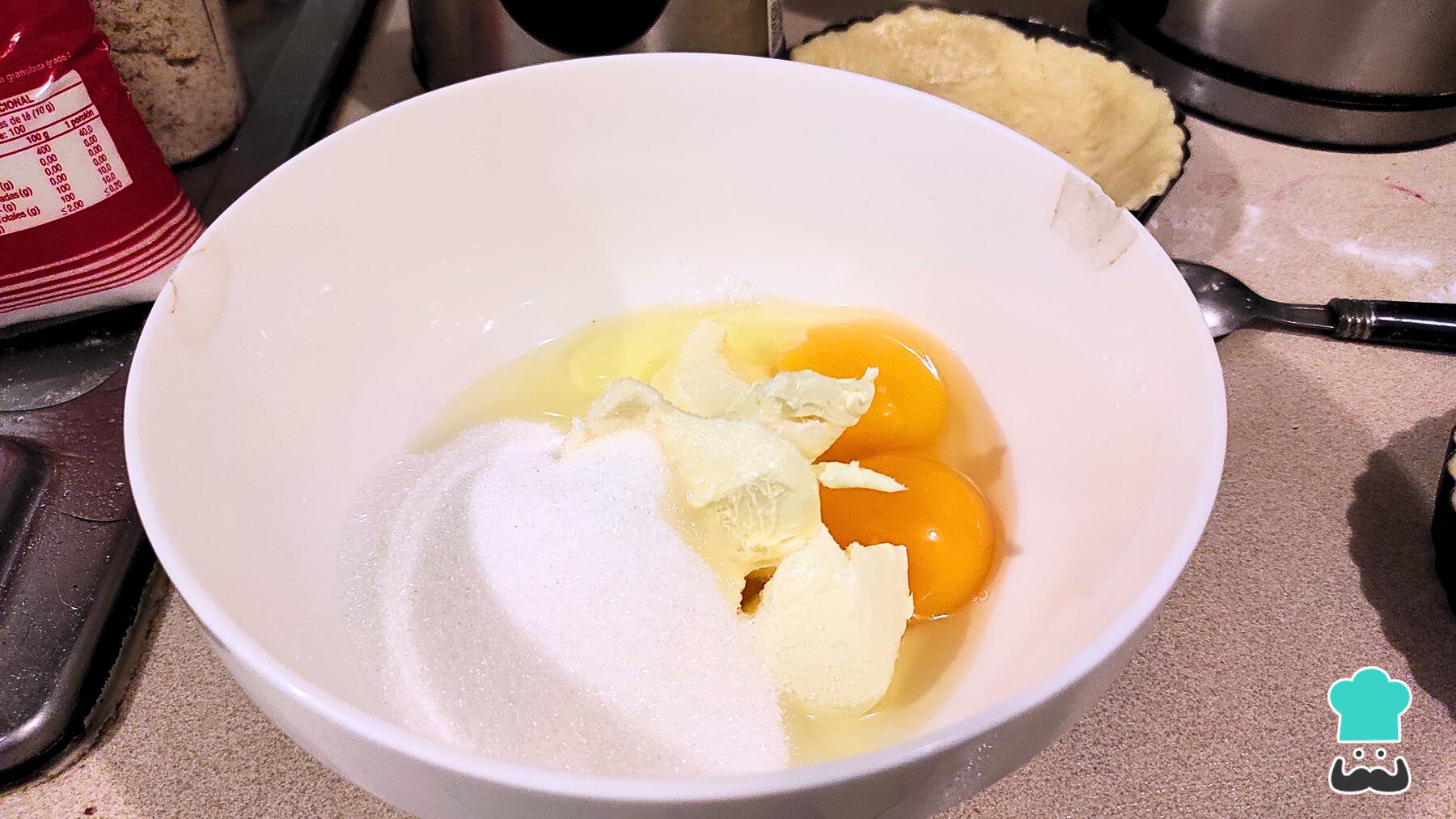 Prepara el relleno mezclando en un bowl todos los ingredientes húmedos: huevos, azúcar y crema de leche. Bate hasta obtener una mezcla homogénea.