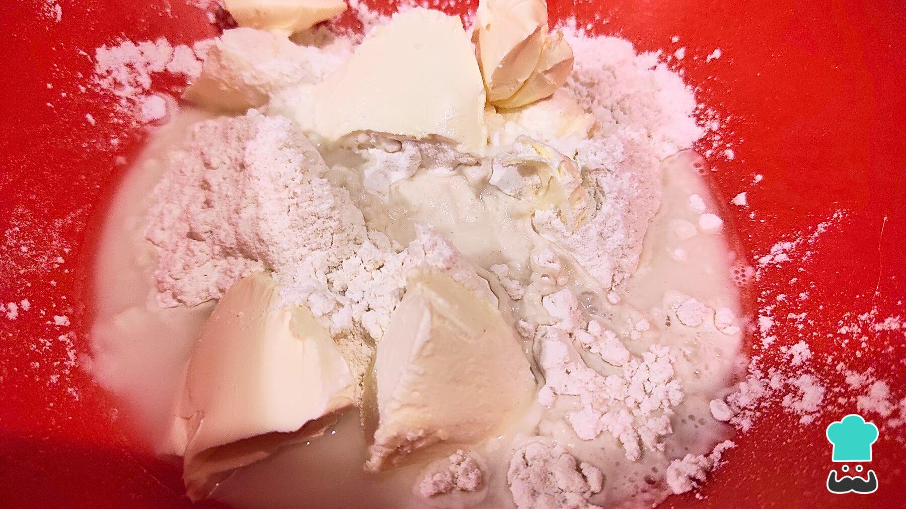 Añade todos los ingredientes de la masa en un bowl y mezcla con las manos.