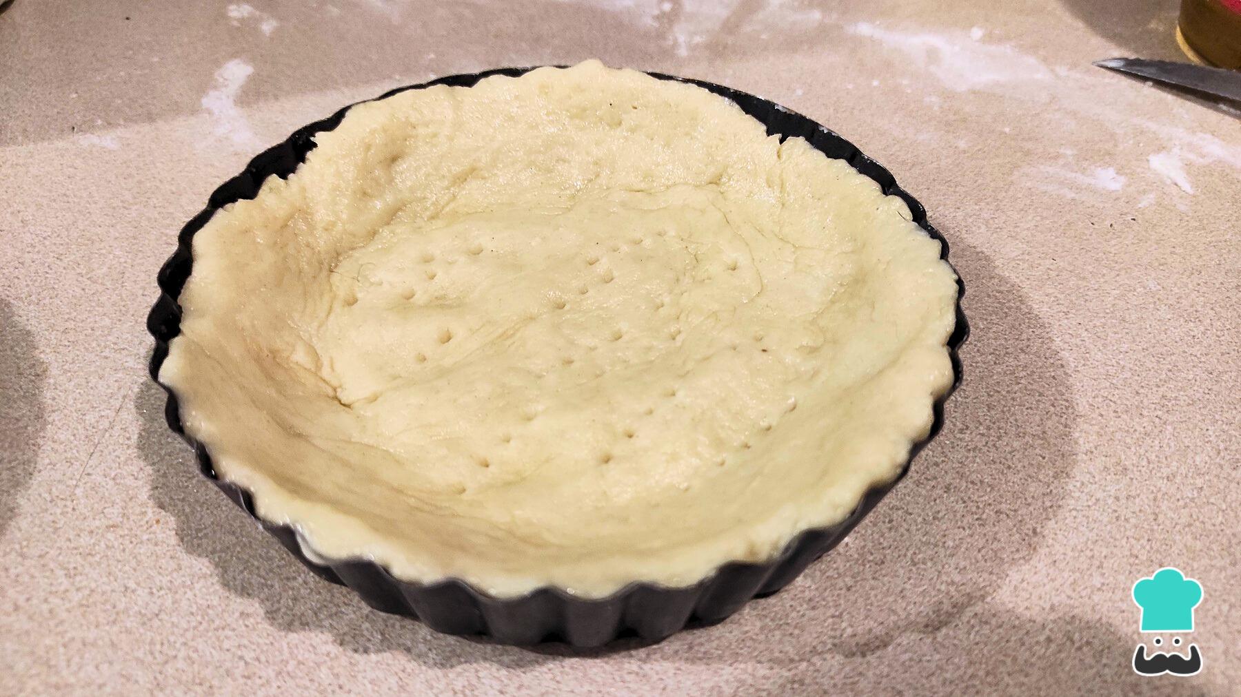 Cubre con la masa la superficie de un molde de tarta aceitado de 20 a 24 centímetros y pincha la masa con un tenedor. Hornea 10 minutos a 180 °C con calor arriba y abajo.