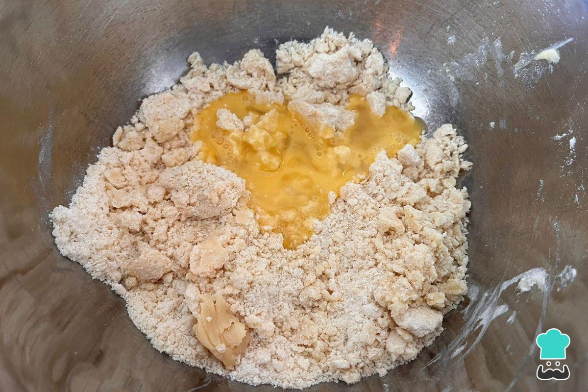 En un bol, agrega la harina, el azúcar flor y la mantequilla. Mezcla con las yemas de los dedos hasta obtener una textura arenosa. Luego, incorpora el huevo y mezcla hasta formar una masa homogénea.