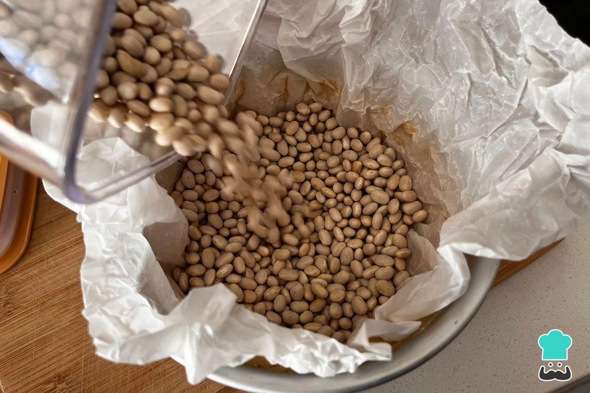 Arruga un papel de horno y colócalo sobre la mezcla de la base. Agrega legumbres secas para darle peso y hornea por 10 minutos a 180 °C. Mientras tanto, lava las manzanas, pélalas y córtalas en cubos.