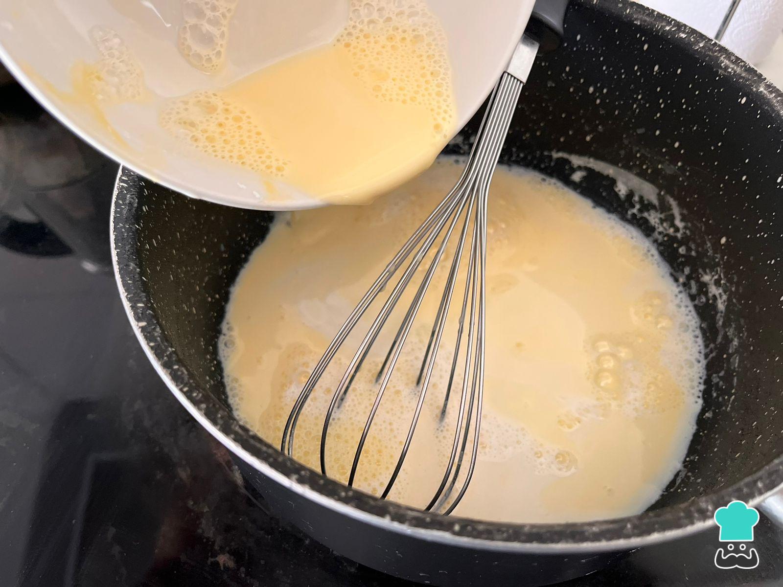 Para preparar la crema pastelera, calienta en una olla aproximadamente 400 ml de leche (reserva el resto) junto con el azúcar a fuego medio. Mientras tanto, en otro recipiente mezcla el resto de la leche líquida con las yemas de huevo y la maicena, removiendo bien hasta integrar completamente. A continuación, añade la mezcla a la olla con leche líquida.