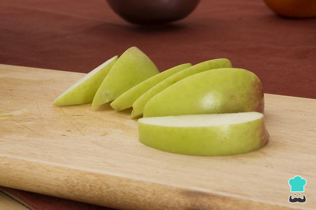 Para empezar con la receta de kuchen de manzana primero cortalas manzanas en gajos finos y mezcla con el azúcar, la canela en polvo y la harina para preparar el relleno del kuchen de manzana casero fácil. Resérvalo para más adelante.