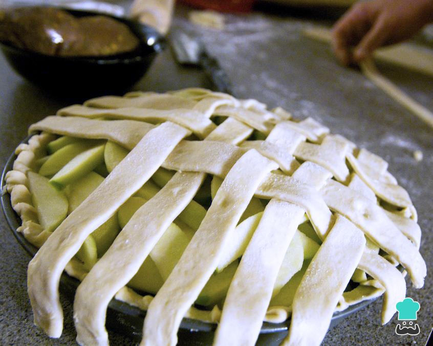 Ahora, incorpora dentro del kuchen alemán el relleno que preparaste con las manzanas y repártelo bien por toda la masa. Coge la masa que reservaste, extiéndela y corta tiras finas. Coloca estas tiras sobre el relleno de manera que formen una cuadrícula. Mientras, pre calienta el horno a 180 ºC hasta que esté caliente.