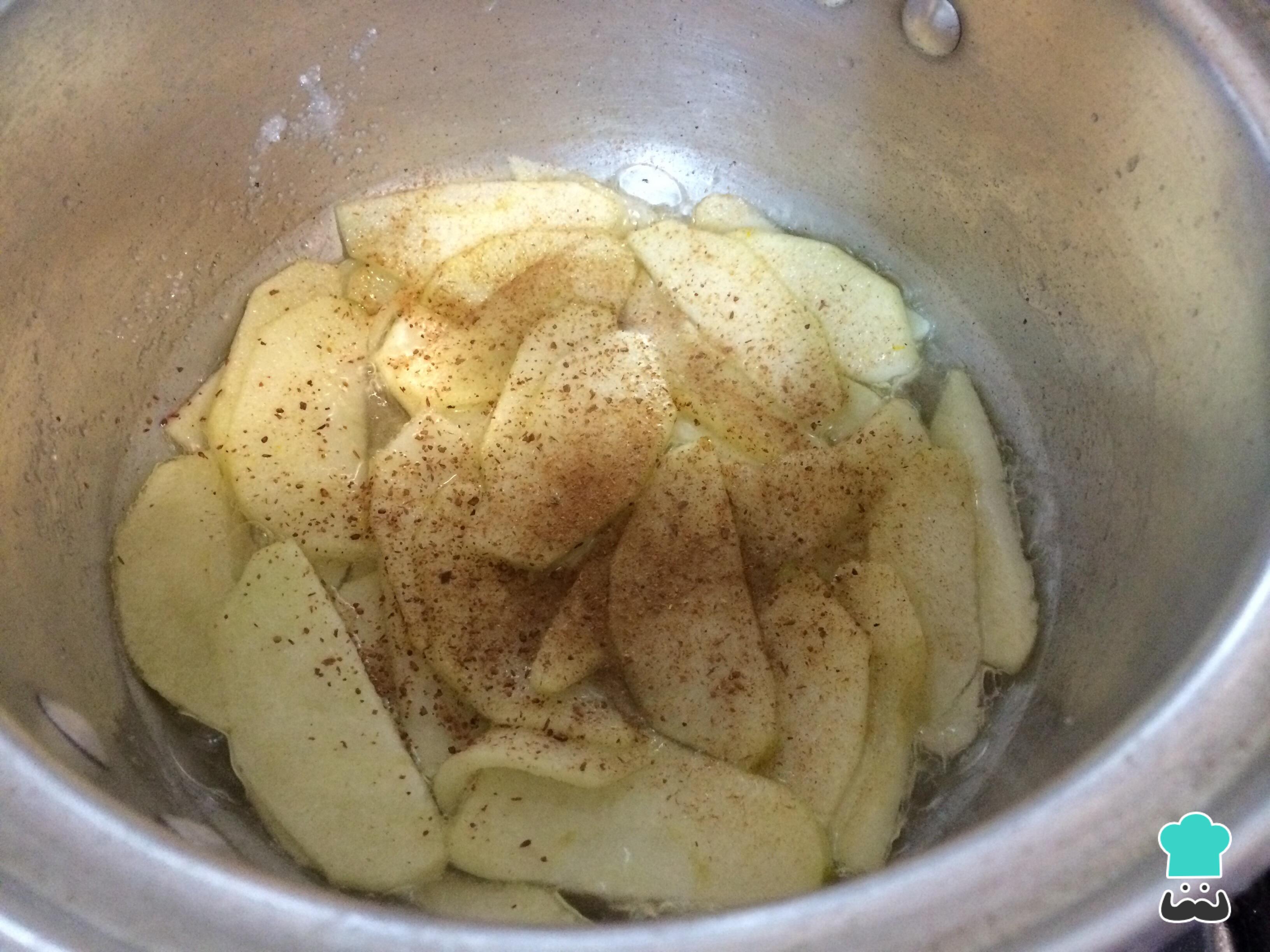 Para el relleno, pelar una manzana, cortar en rodajas y añadirla a una olla junto con el azúcar, unas gotas de limón y de esencia de vainilla, media cucharadita de canela y dos cucharadas de agua. Cocinar a fuego bajo hasta obtener una mermelada.