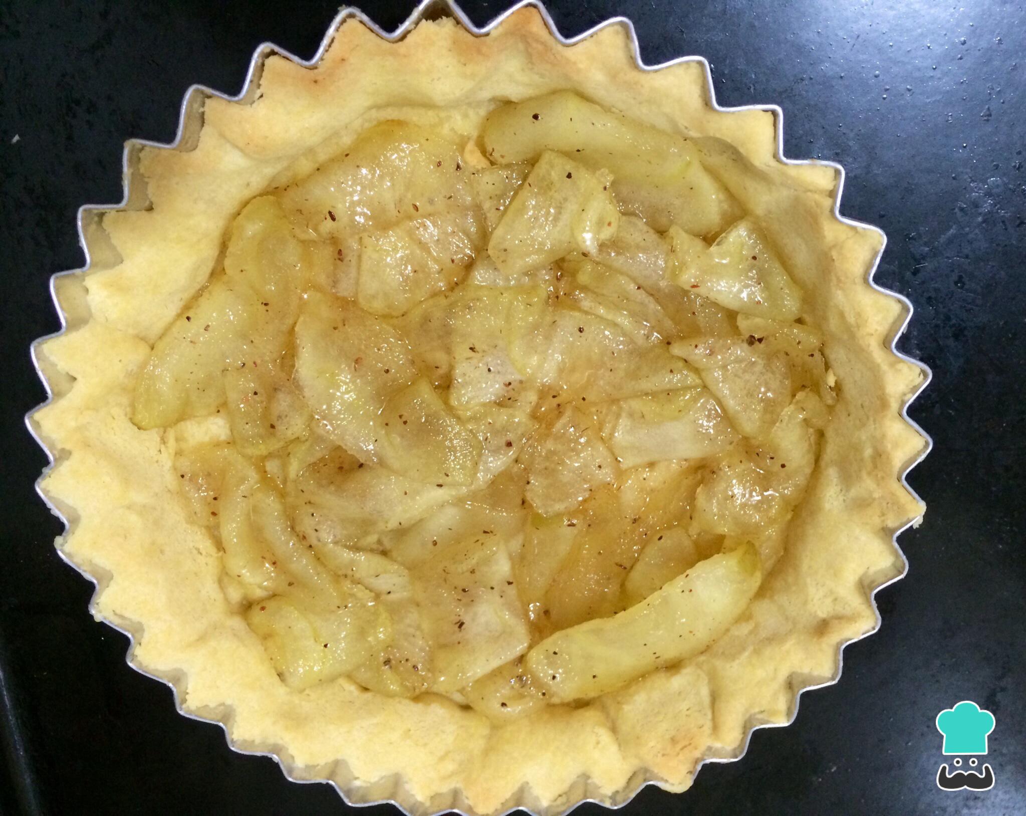 Retirar la tarta del horno y añadir el relleno de manzana, esparcir muy bien.