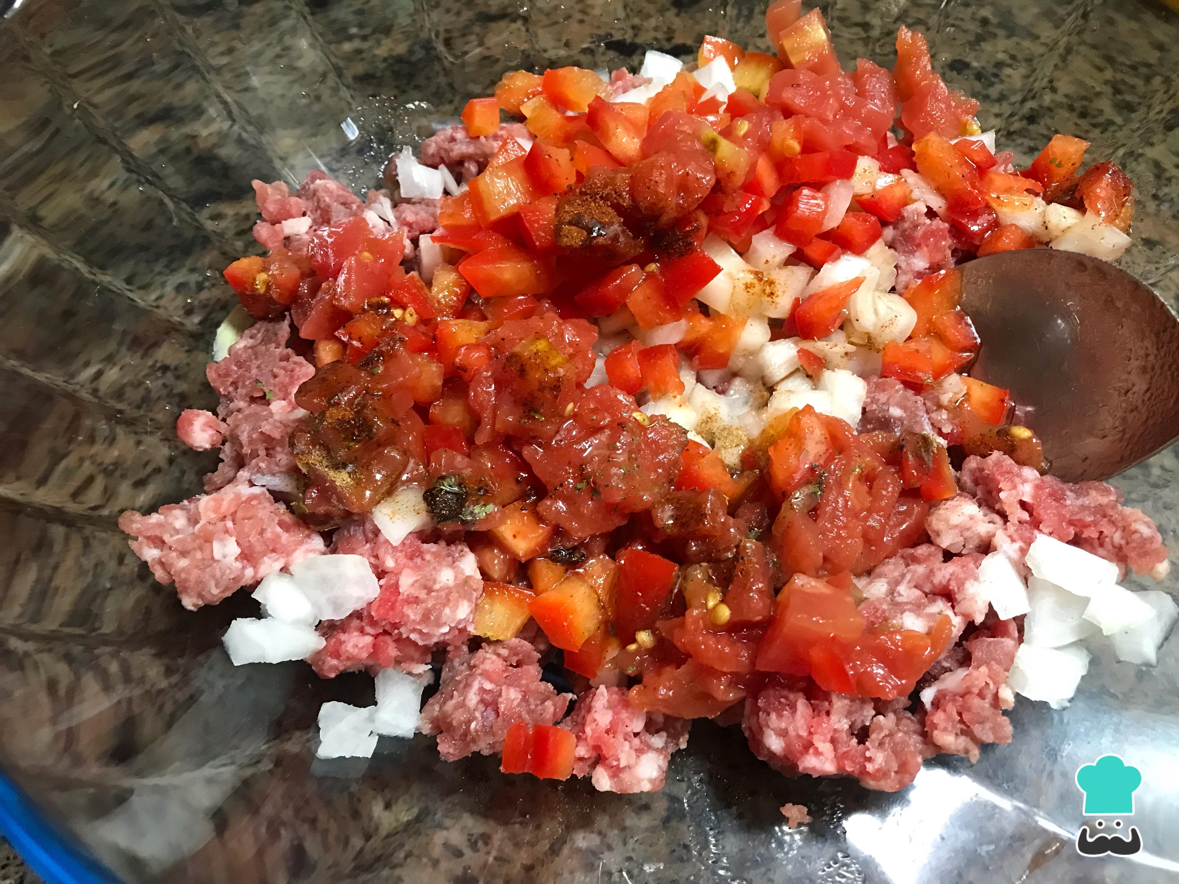 Mientras, prepara la carne de tu lahmacun. Para ello, mezcla la carne con la cebolla, el tomate enlatado y el morrón picado. Condiméntala con el comino, el pimentón, la pimienta y el aceite. Resérvala. Si no tienes tomates enlatados, puedes lavar y hacer un corte superficial en la piel de la base de un tomate fresco. Húndelo en agua hirviendo por 1 minuto y pélalo. Luego, córtalo en cubos pequeños y mézclalo con la carne.