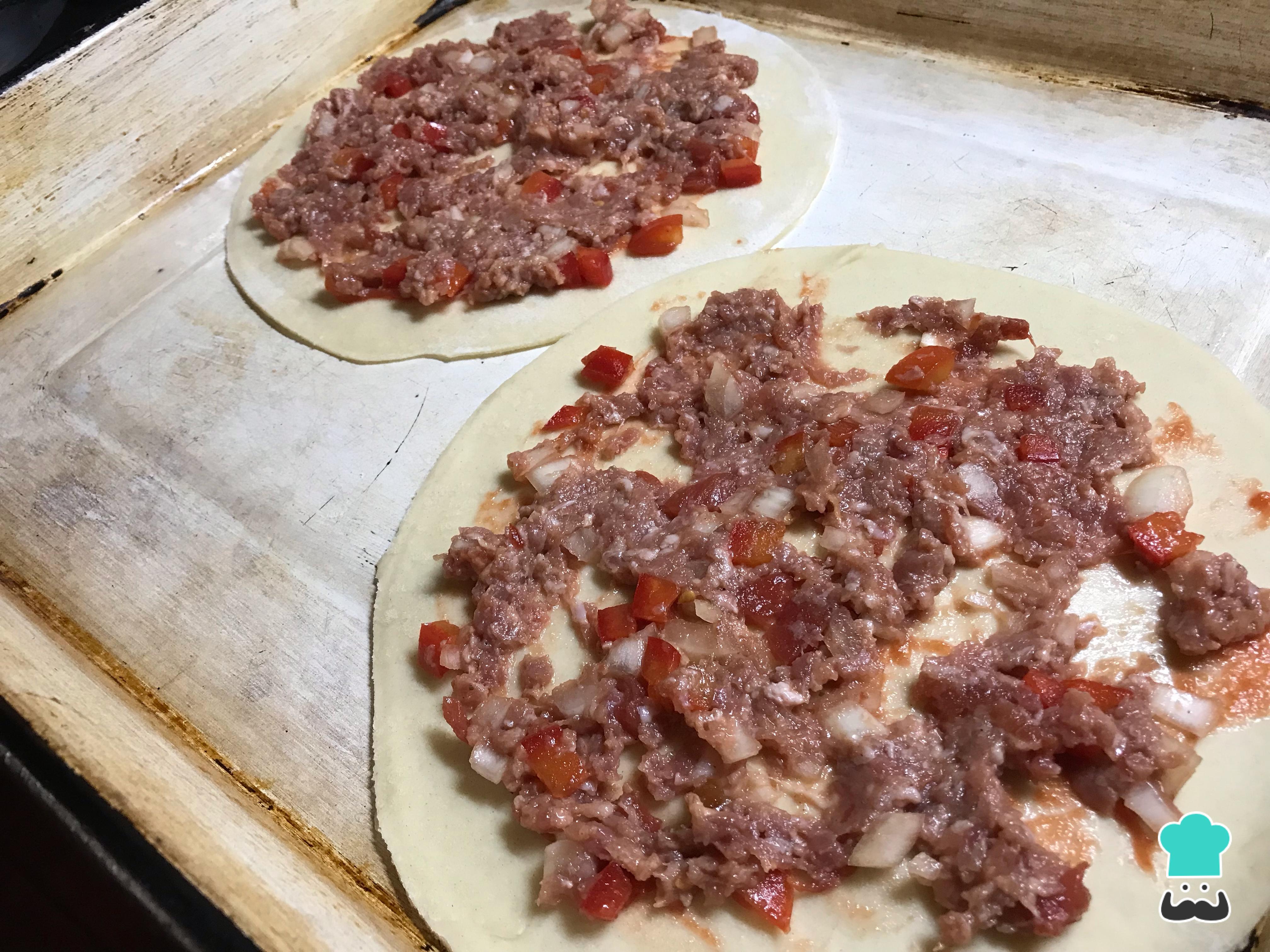 Agrega la carne que has macerado con los condimentos y verduras y añade sobre la masa. ¡Ya casi está la pizza turca!