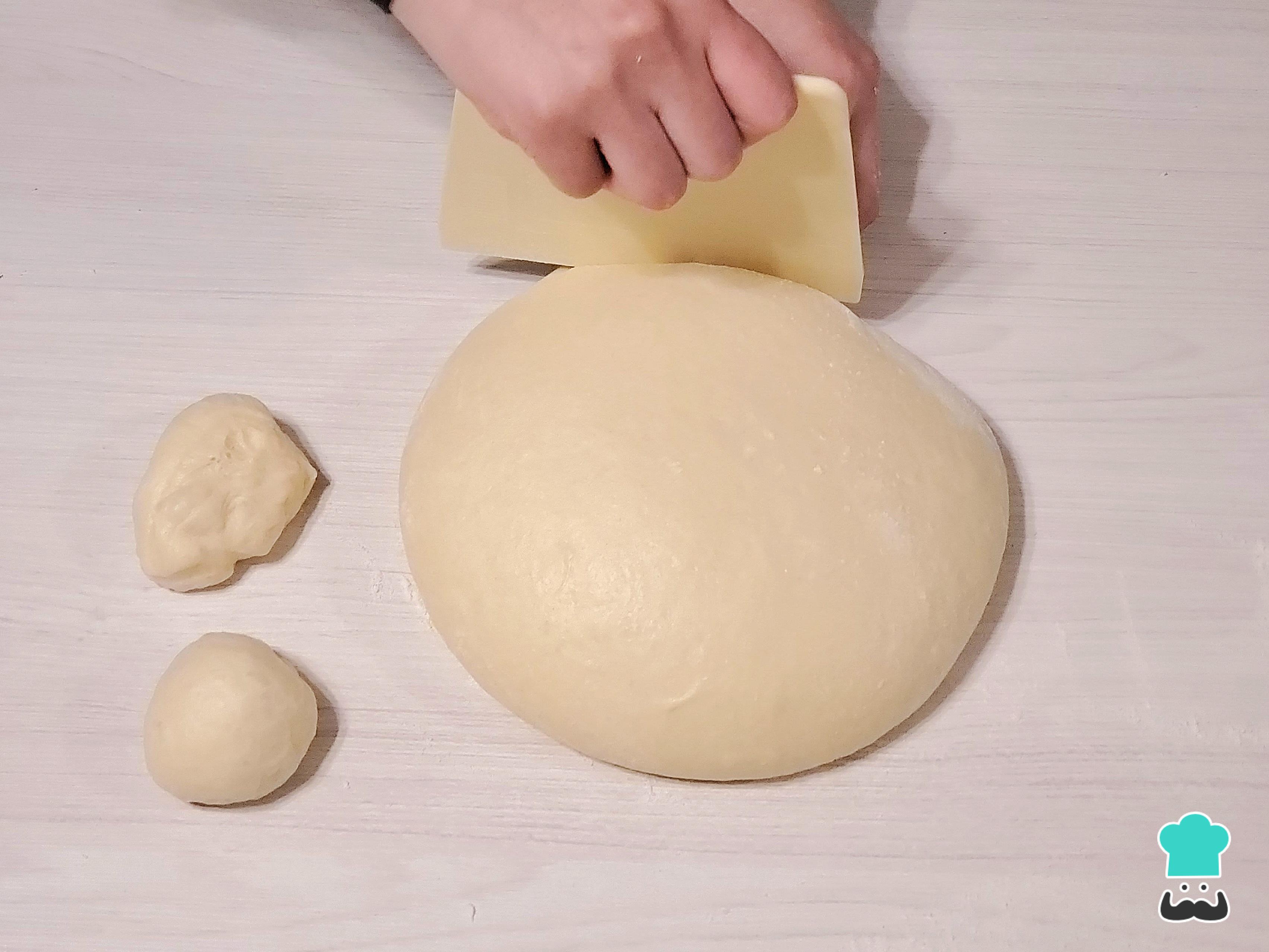 Cumplido el tiempo de reposo, desinfla y divide la masa. Luego, estira cada una de las bolitas hasta que tengan una forma redonda y aplanada.