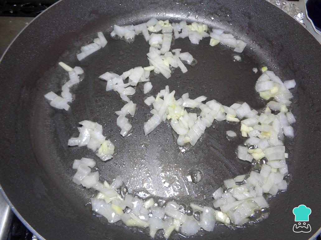 Para comenzar vamos a picar finamente la cebolla y el ajo, y los ponemos a sofreír en la mantequilla derretida hasta que la cebolla se observe transparente.