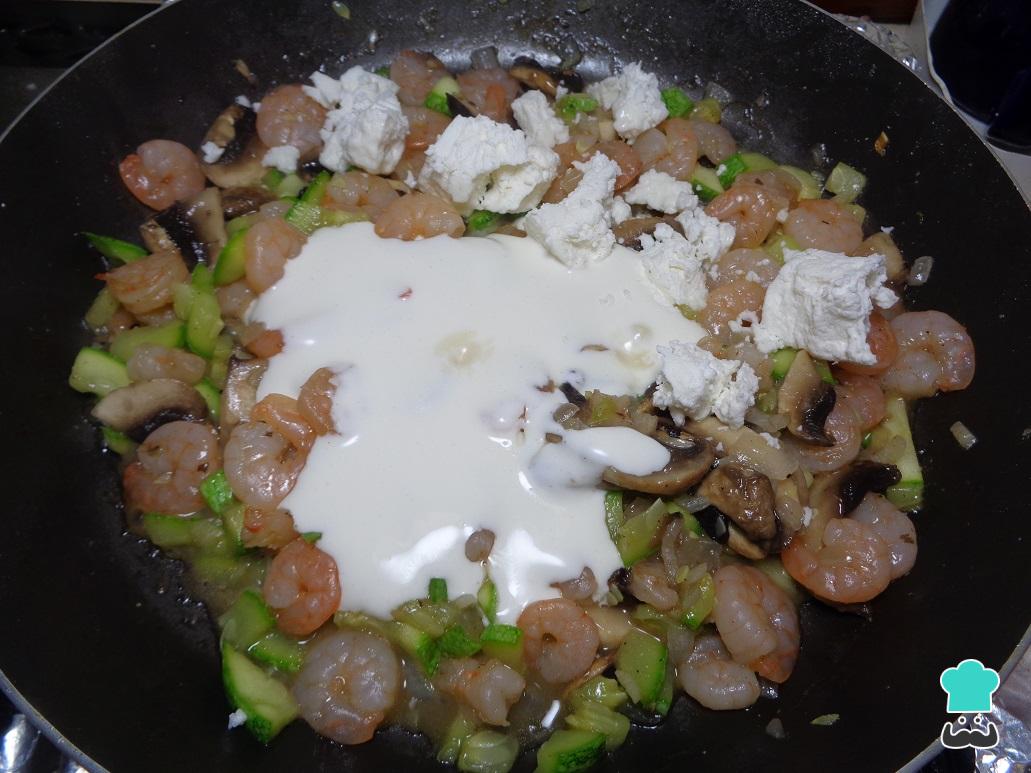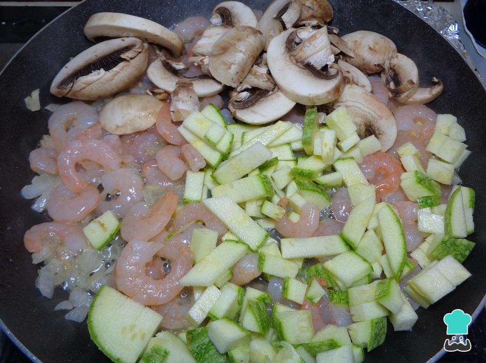 Una vez lista la cebolla, añadimos los camarones perfectamente limpios junto con los champiñones rebanados y la calabaza finamente picada.