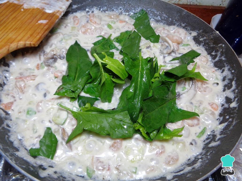 FInalmente, añadimos las espinacas perfectamente limpias y removemos nuestro guiso para la lasaña de verduras y camarones.