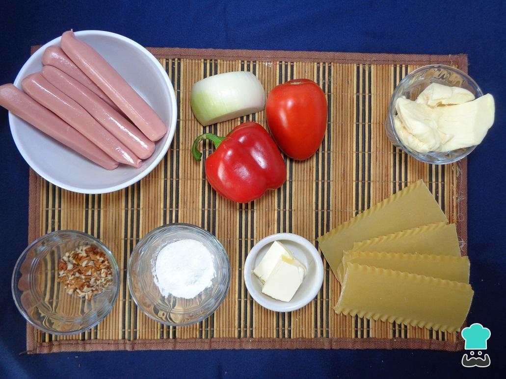 En la siguiente imagen podrás observar los ingredientes que necesitaremos para la preparación de esta deliciosa lasaña de salchicha, no pierdas ningún detalle.