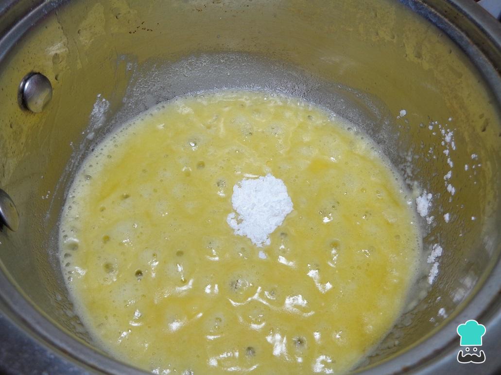 Vamos a comenzar la receta de lasaña casera preparando la salsa bechamel. Para ello, colocamos en una cacerola caliente la mantequilla, y una vez derretida añadimos la fécula de maíz sin dejar de mezclar en ningún momento.
