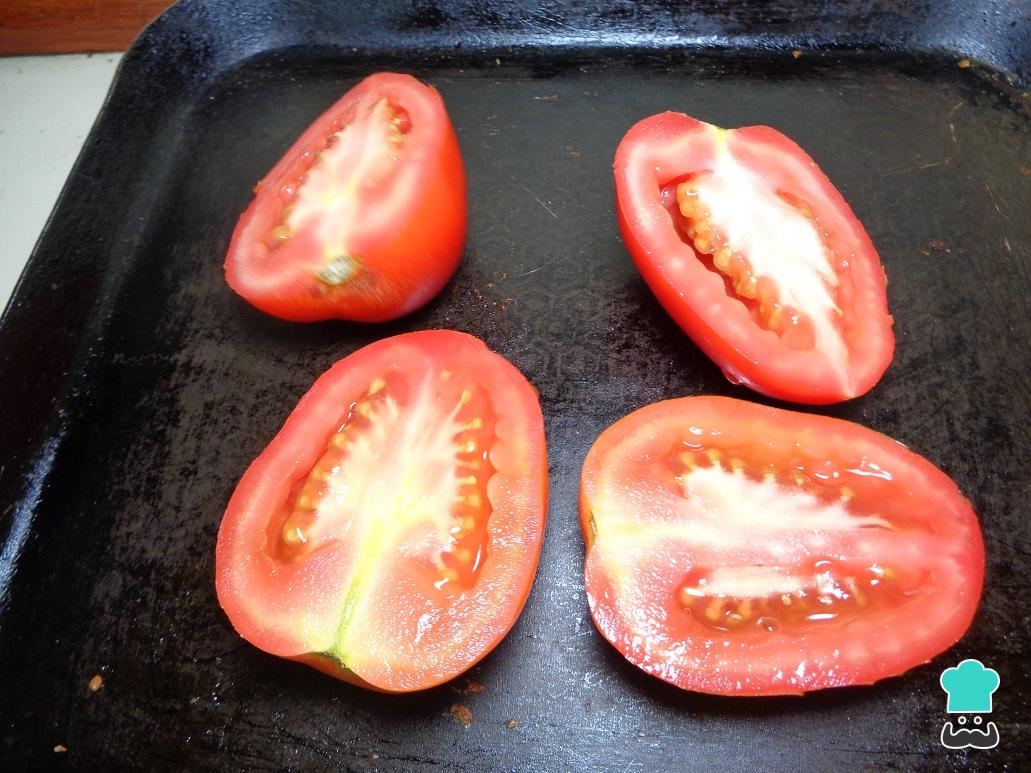 Por otro lado, para continuar con la elaboración de la lasaña de salchichas, ponemos a freír los tomates rojos cortados por la mitad, hasta que adquieran una textura suave.