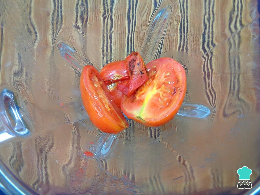 Una vez listos, los llevamos a la licuadora, añadimos medio vaso de agua y licuamos hasta obtener una salsa de tomate homogénea, la cual reservamos un momento.