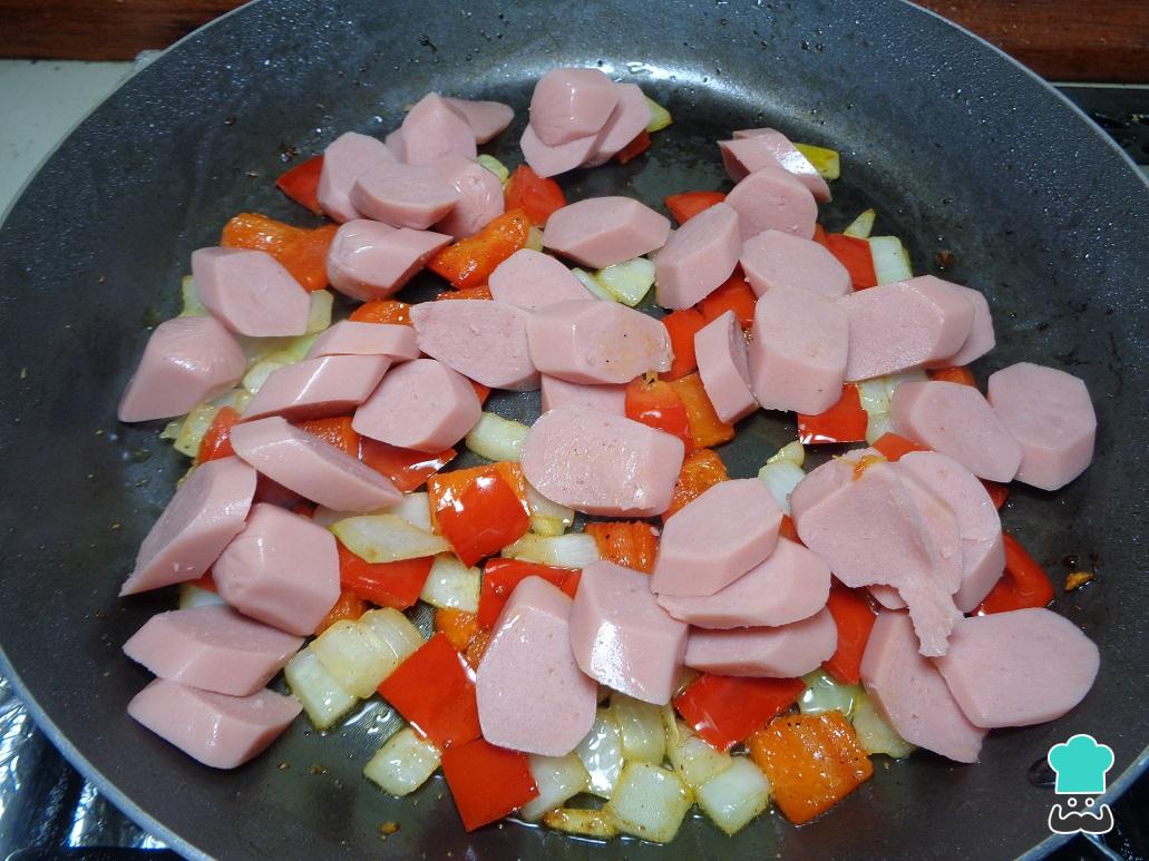 Ahora, en una sartén con un poco de aceite caliente añadimos la cebolla finamente picada junto con el pimiento también finamente picado, agregamos una pizca de sal y pimienta y dejamos que se sofrían. Una vez que la cebolla se observe transparente, añadimos la salchicha rebanada en rodajas finas y dejamos que se guise junto unos minutos más.
