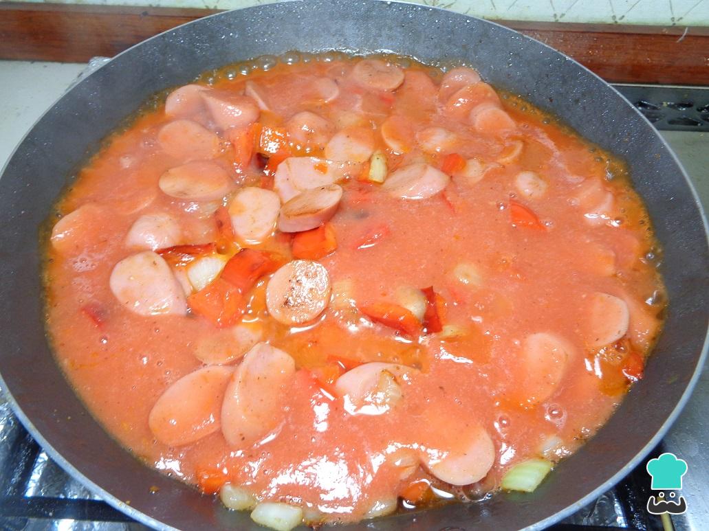Una vez frita la salchicha, vertemos sobre ella la salsa de tomate que preparamos hace un momento y dejamos que todo se sazone perfectamente. Cuando la preparación suelte el primer hervor, retiramos del fuego y reservamos un momento para seguir con la elaboración de la lasaña de salchichas casera.