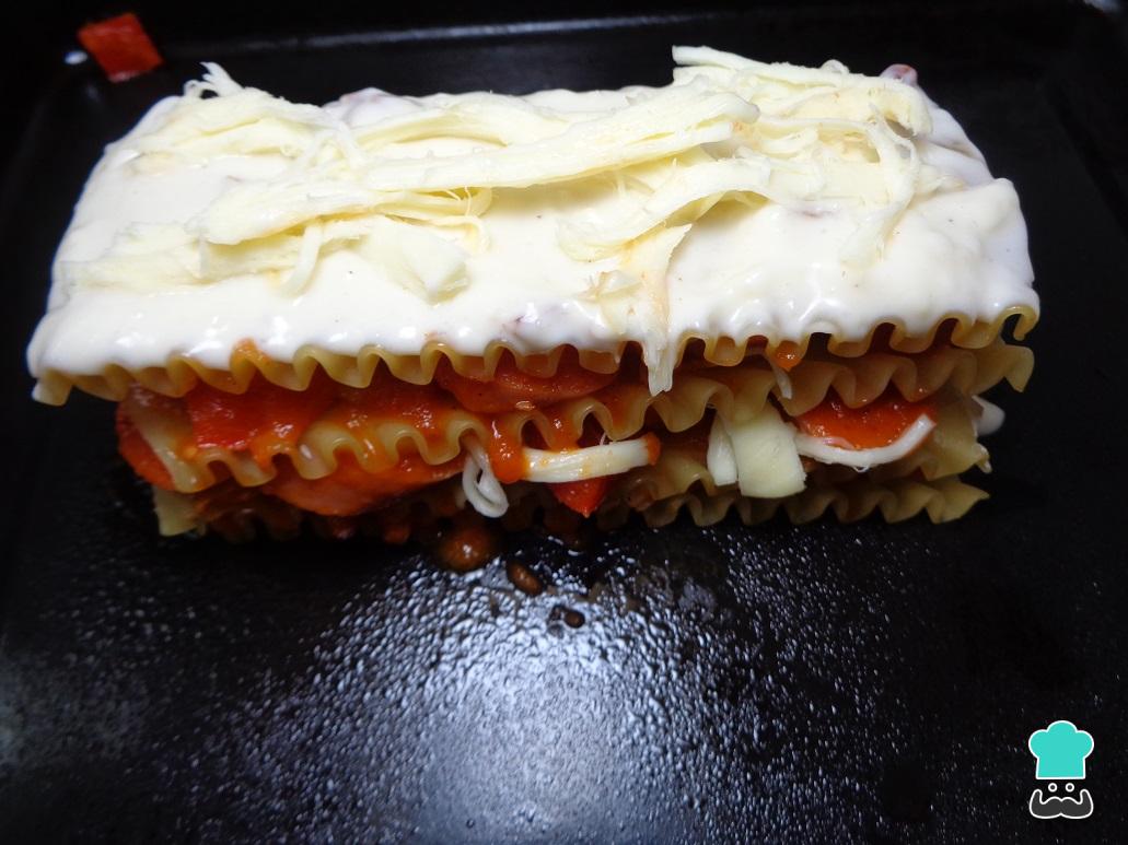 Terminamos los niveles de nuestra lasaña casera con una última lámina de pasta sobre la cual vertemos la salsa bechamel y un poco de queso de hebra, tal y como se muestra en la imagen. Una vez lista, horneamos la lasaña de salchicha a 180 °C durante 7 minutos.