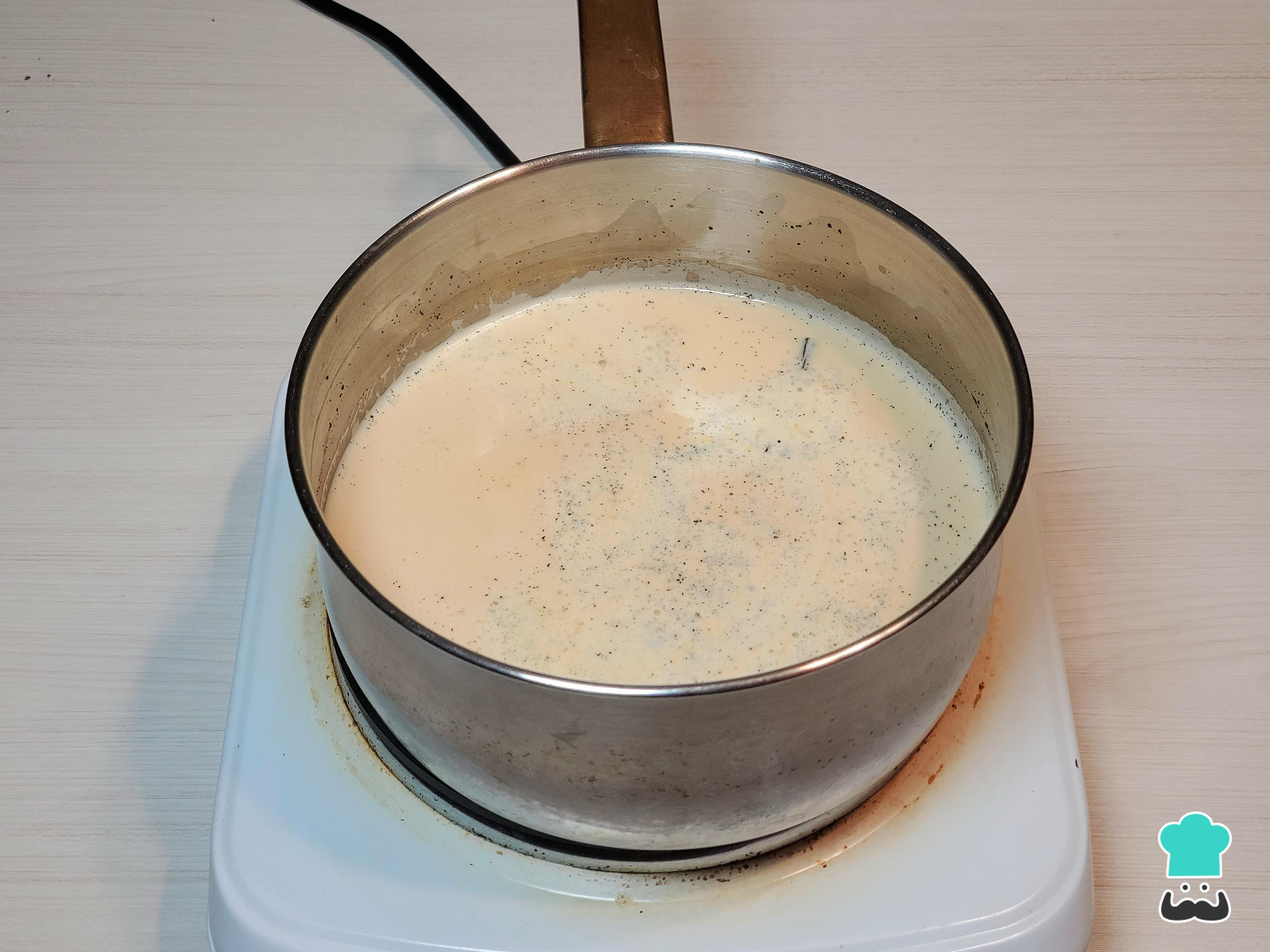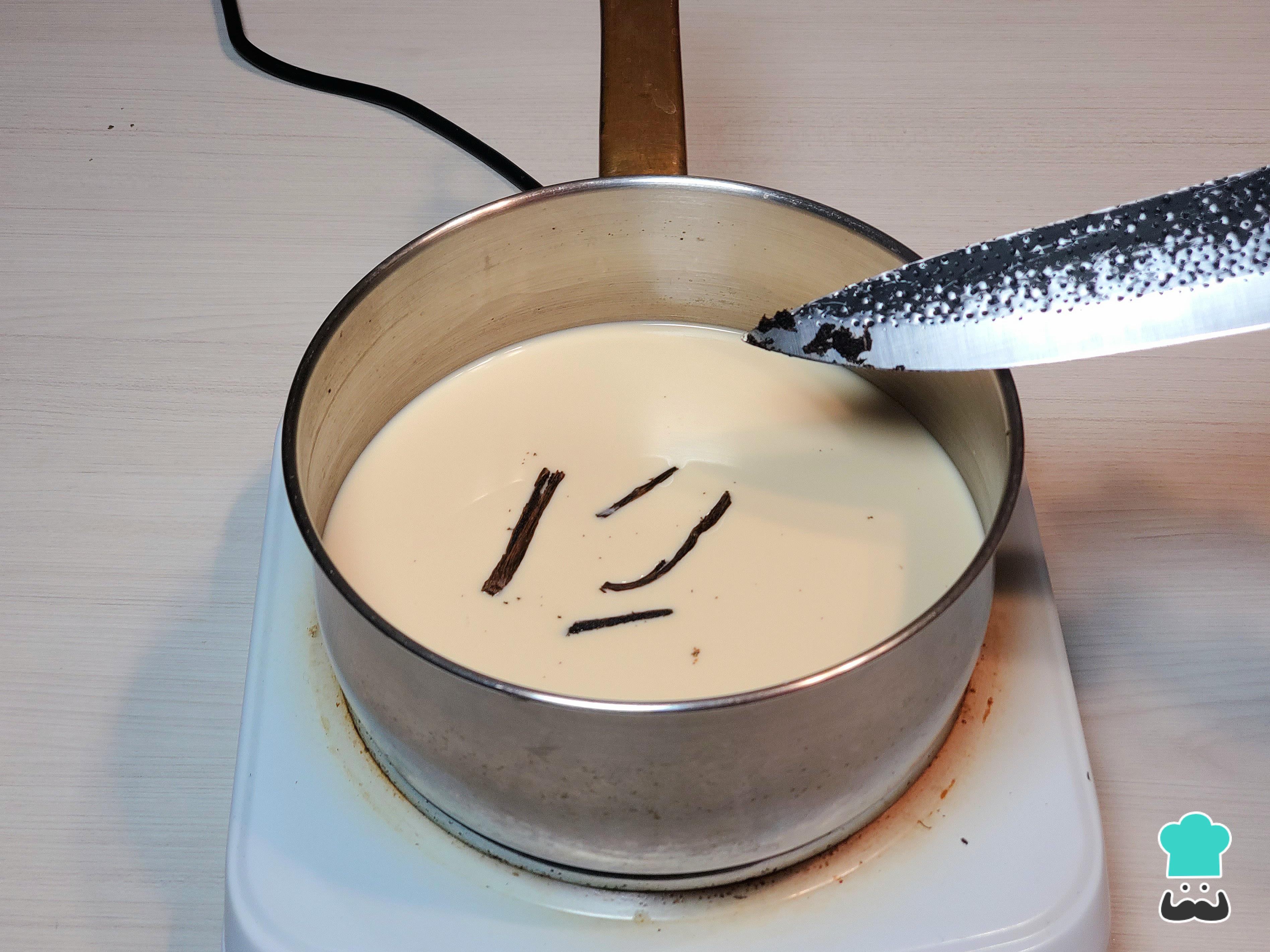 Para empezar a preparar esta deliciosa leche asada, lo primero que debes hacer es volcar la lata de leche en una cacerola. Utiliza latas estándar de 397 gramos. Enciende la hornilla para que se caliente, corta una vaina de vainilla por la mitad, raspa las semillas y colócalas en la leche para aromatizarla.