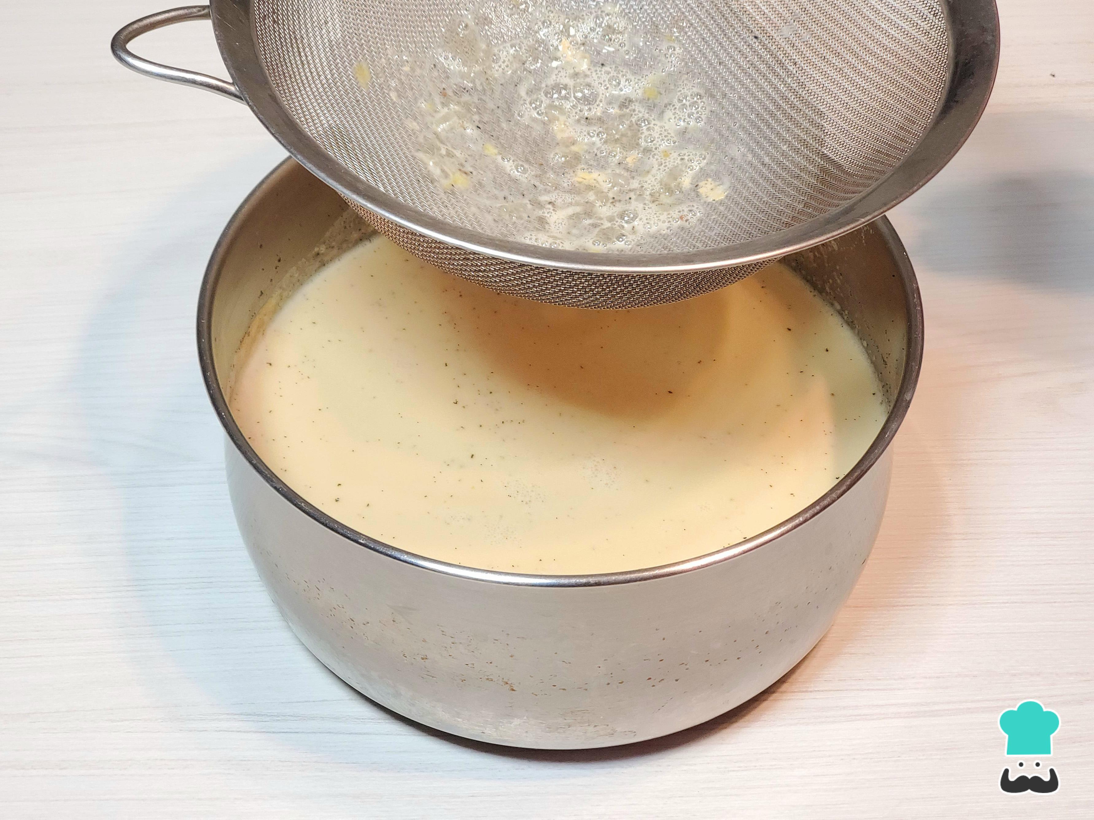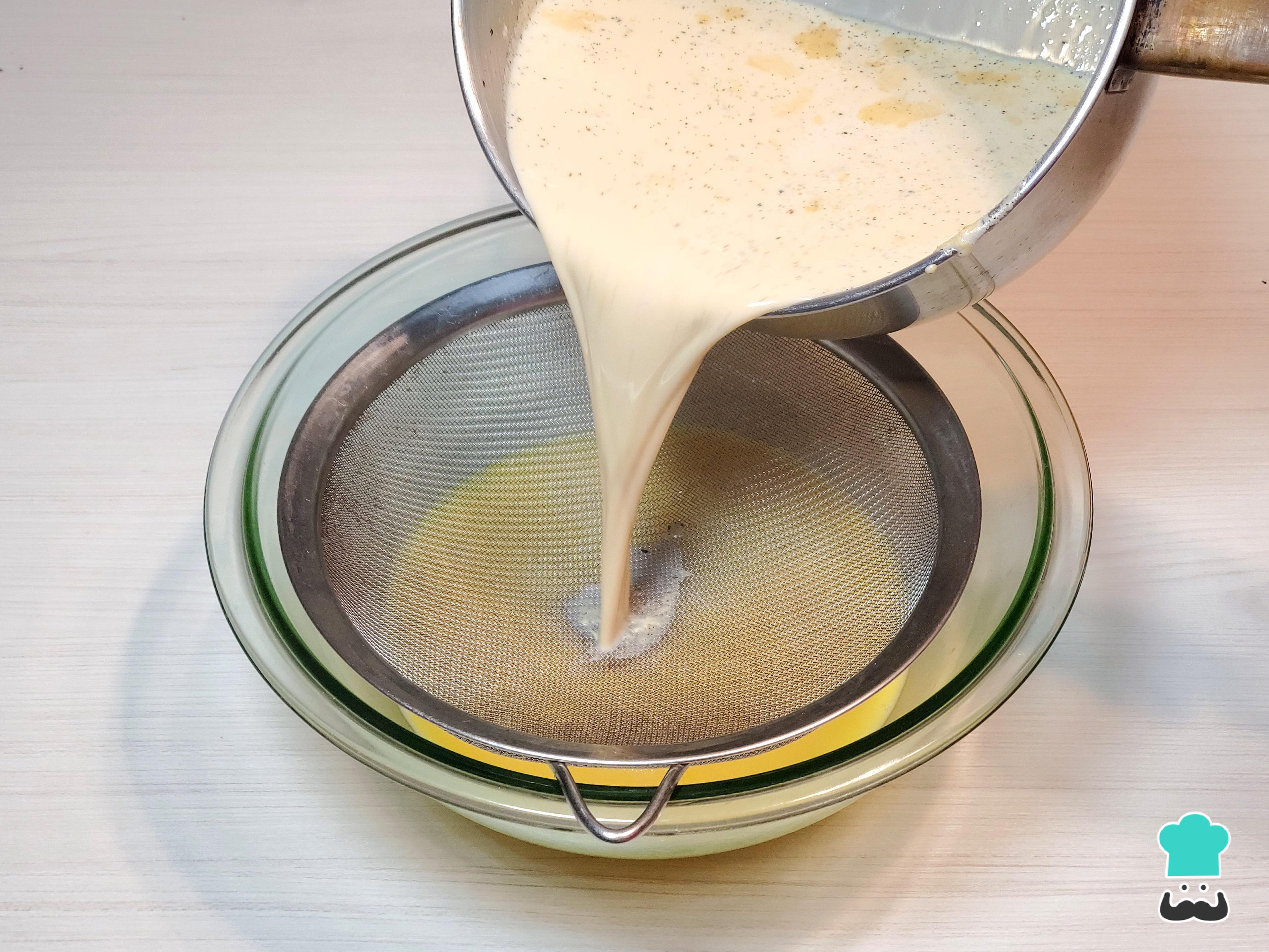 Vierte un poco de la leche caliente en el bowl con los huevos, colando previamente. Bate mientras agregas la leche hasta que se integren.