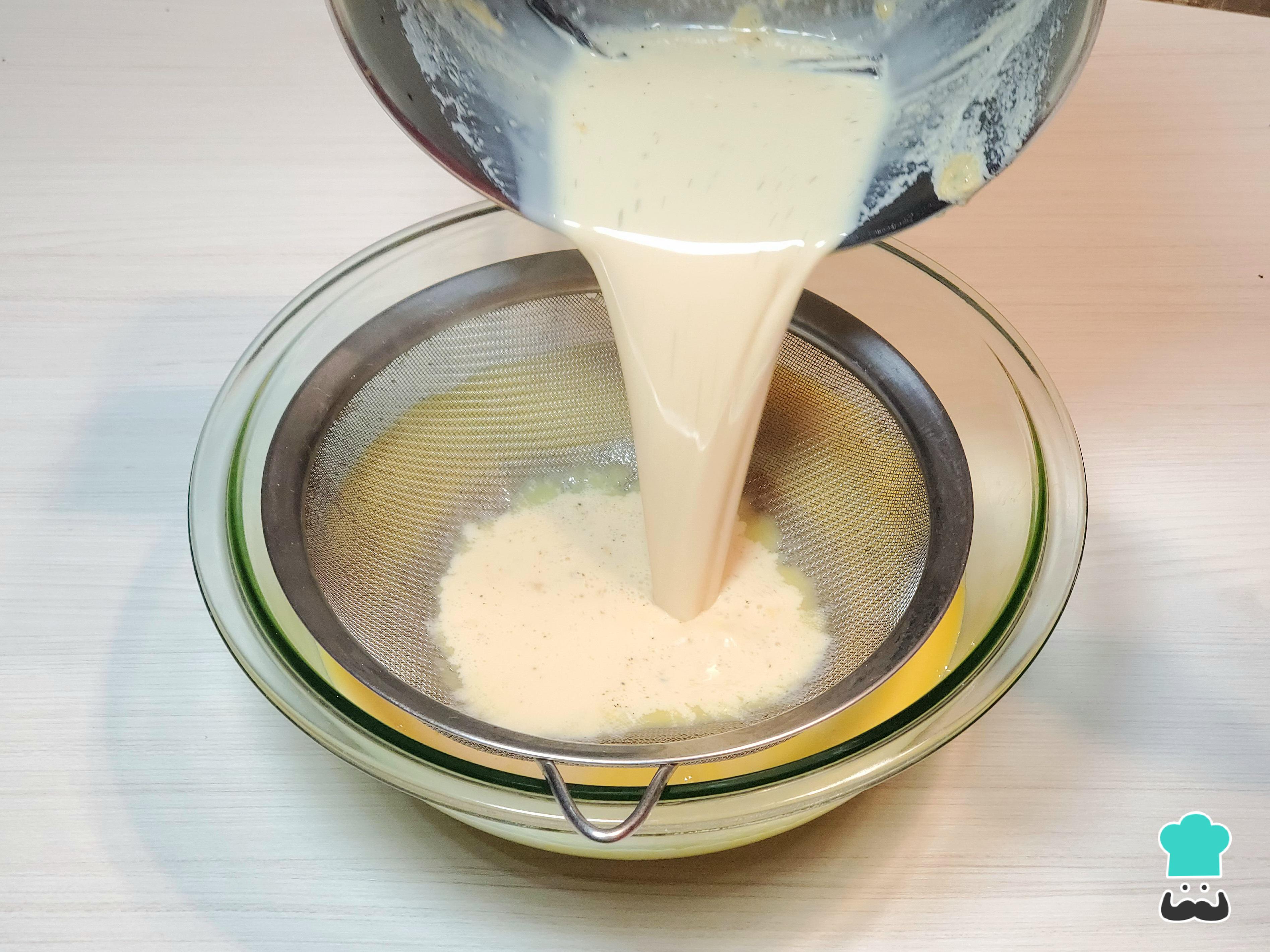 Vierte el resto de la leche colándola y sigue mezclando. No hace falta batir vigorosamente porque se quiere evitar que se formen burbujas en la superficie.