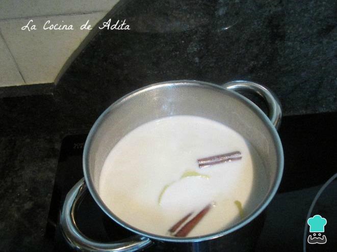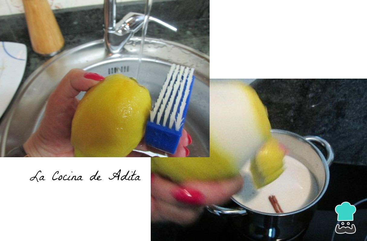 Ponemos en una cacerola la leche con la rama de canela. Cepillamos el limón bajo el grifo, para quitarle la cera que les dan para que brillen, cortamos la piel de medio limón muy fina para que no tenga nada blanco y se lo añadimos a la leche.