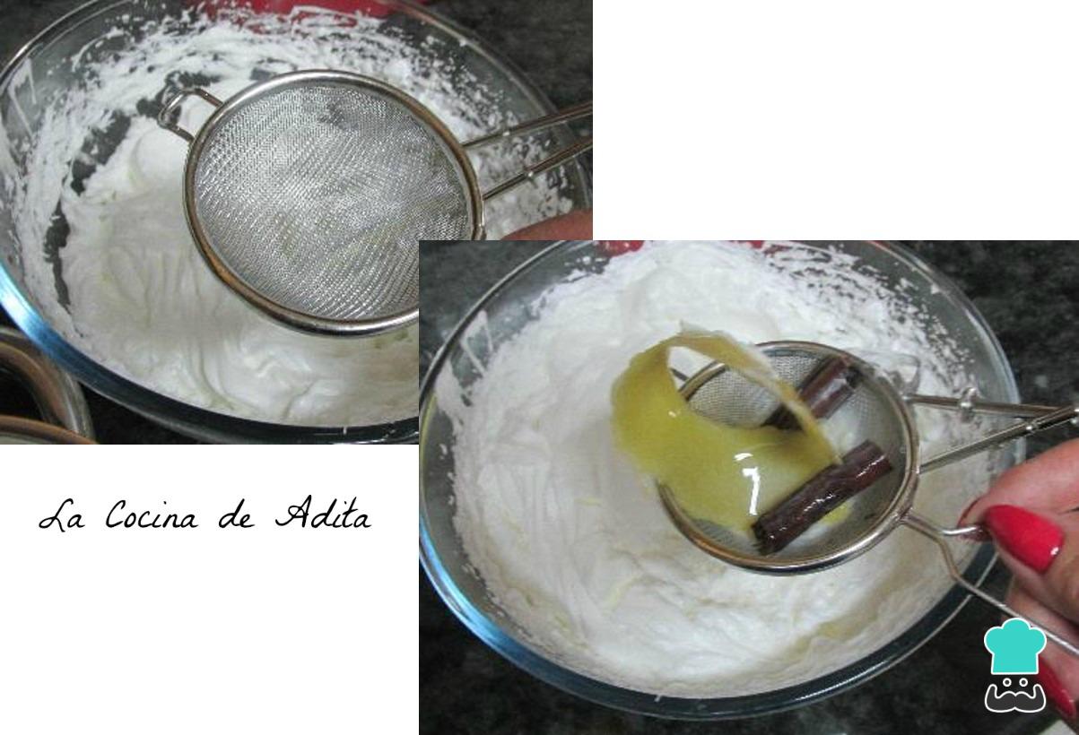 Cuando el preparado de leche y canela este bien frío lo pasamos por un colador y luego lo mezclamos poco a poco con las claras montadas. Revuelve forma envolvente para que éstas no se bajen y ya tendremos la deliciosa leche merengada light. Si quieres hacerla helado, añade esta mezcla a una heladora y programa o mete la mezcla en el congelador y saca cada media hora para remover y volver a congelar, repitiendo el proceso al menos tres veces. Podemos conservarla en el congelador en un recipiente cerrado.