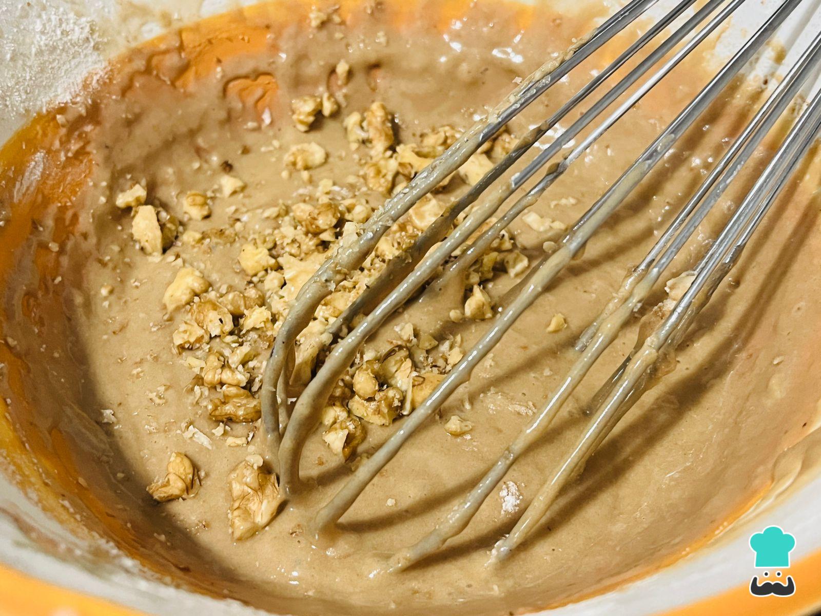 Integrados los líquidos, agrega los secos, es decir, la harina 0000 tamizada, junto con la canela, el polvo para hornear y el bicarbonato. Integra con ayuda de un batidor de mano y agrega las nueces tostadas y picadas.