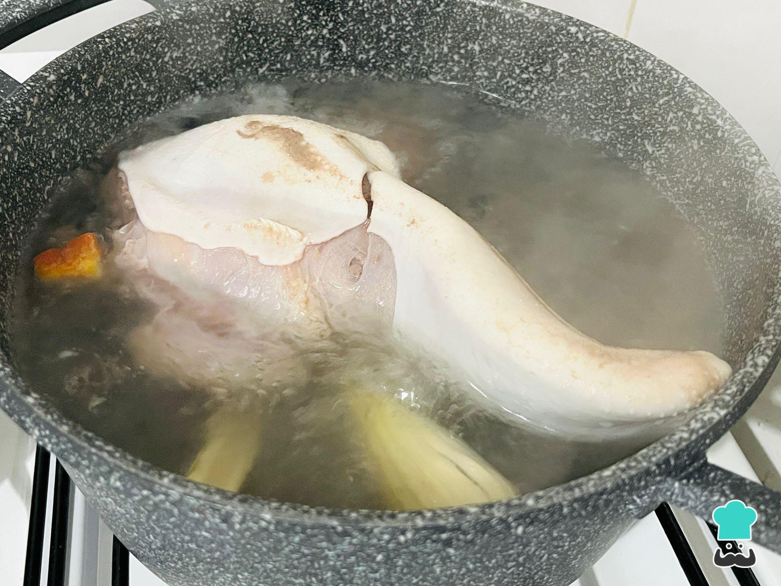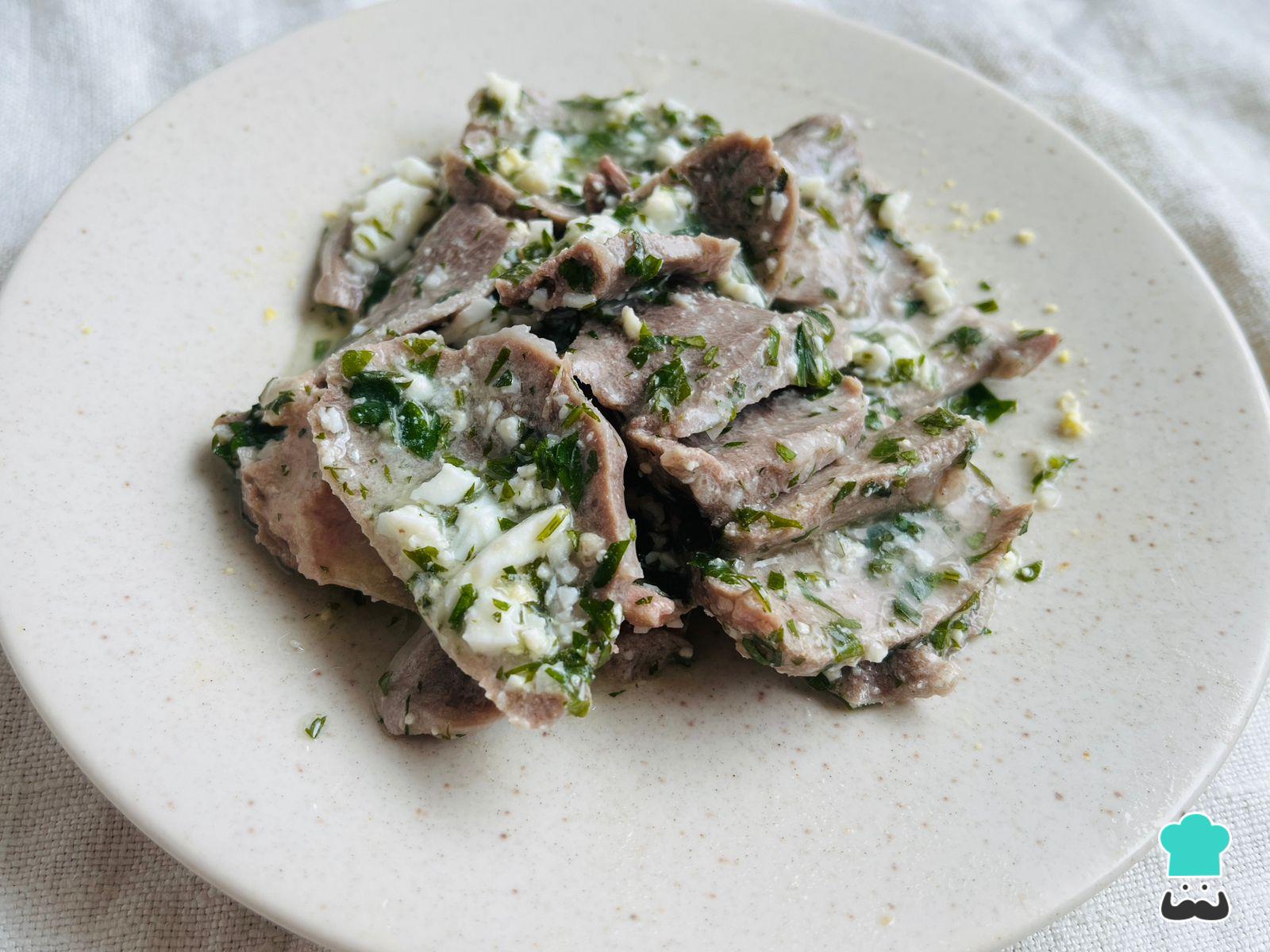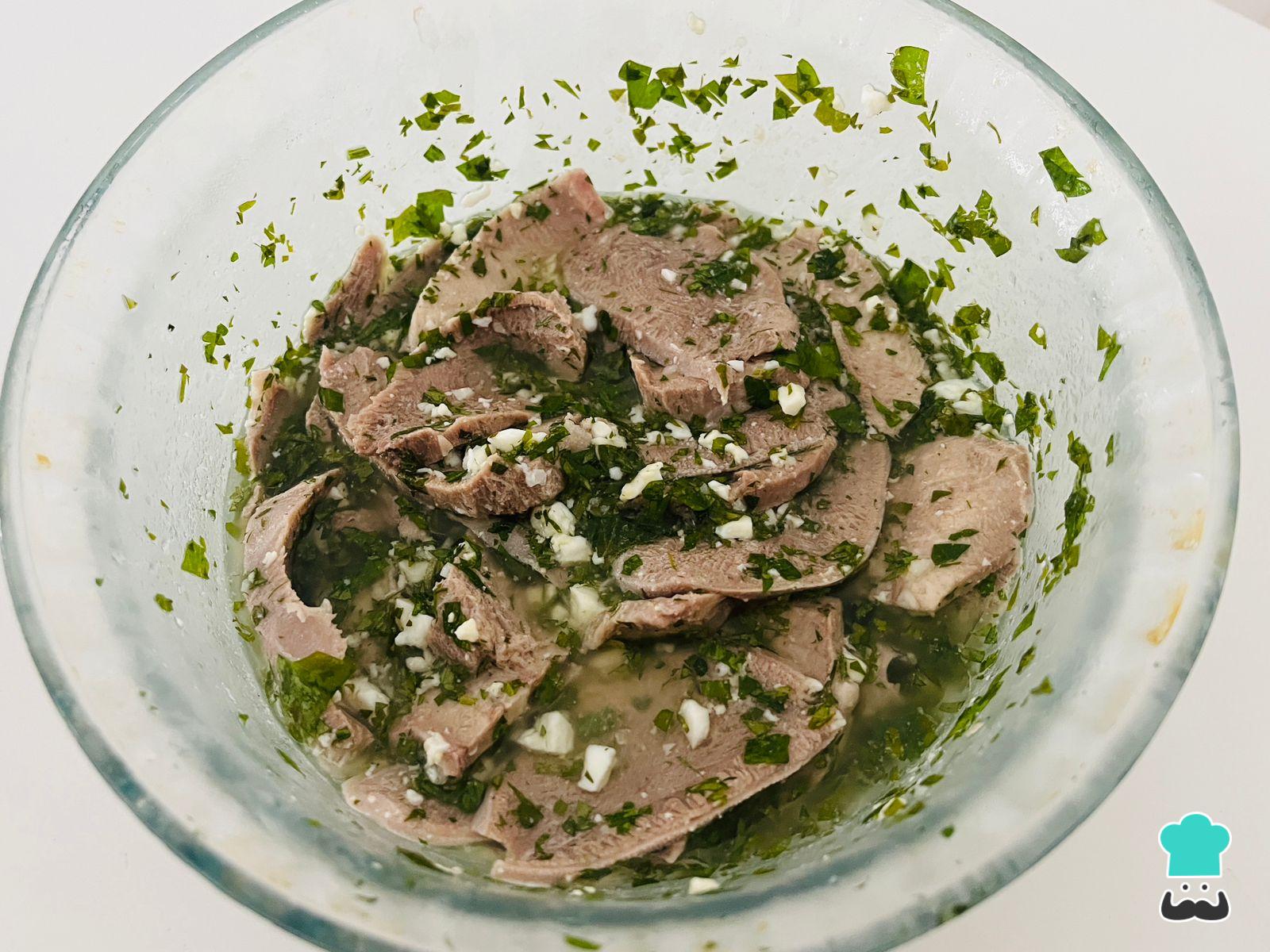 Mezcla todos los ingredientes de la vinagreta, es decir, el perejil, ajo y huevo, con los líquidos: aceite y vinagre. Resérvalo tapado hasta tener lista la lengua.