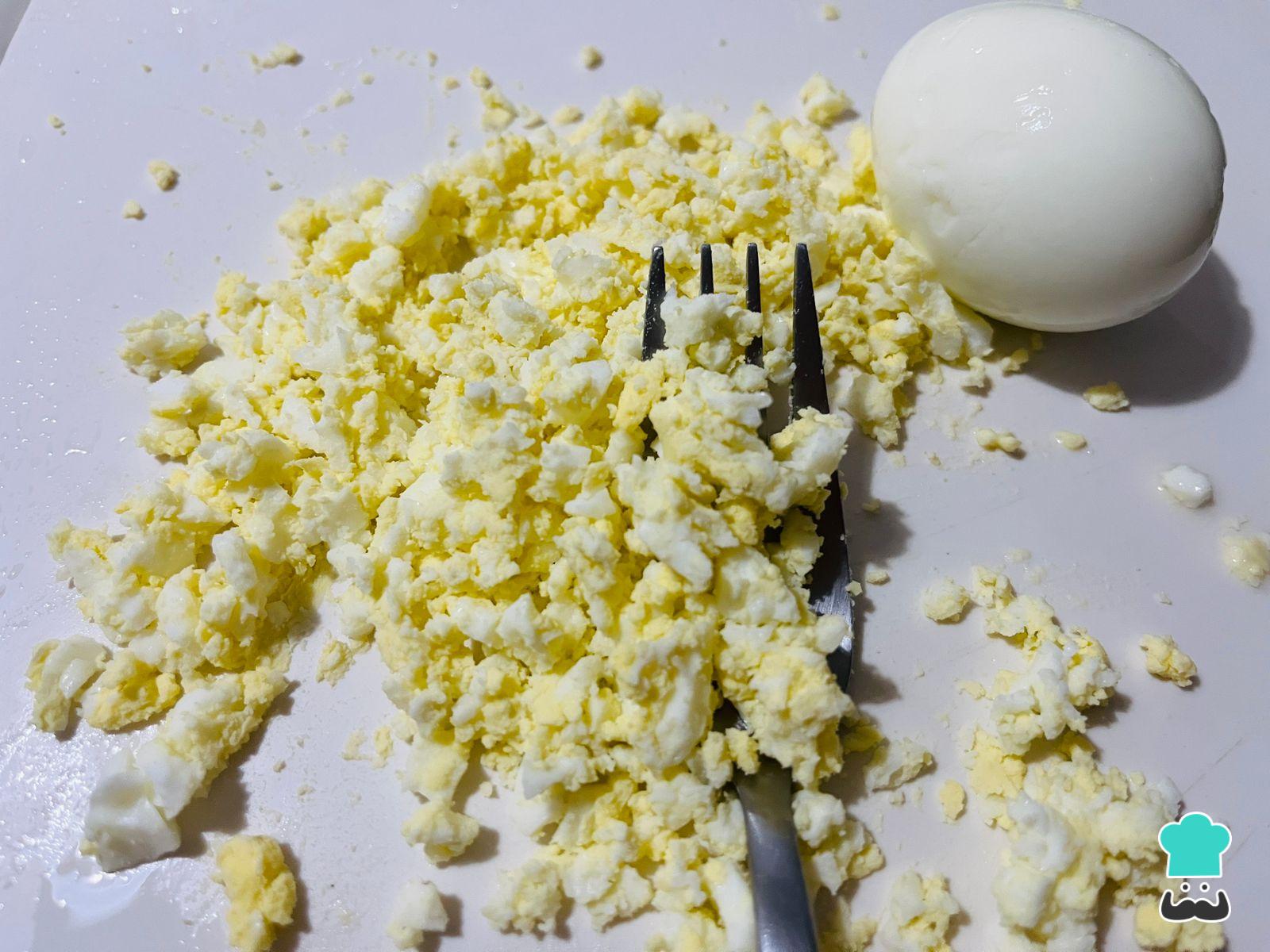 Hierve los huevos desde agua fría por unos 12 minutos. Déjalos enfriar y pícalos.