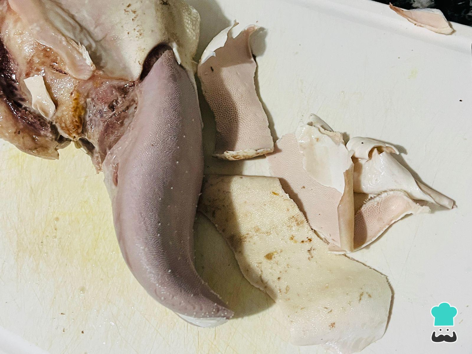 Cuando la lengua esté lista, déjala enfriar para no quemarte y pélala cuidadosamente, para retirar toda la piel dura. También puedes retirar la grasa. Córtala en rodajas finas.