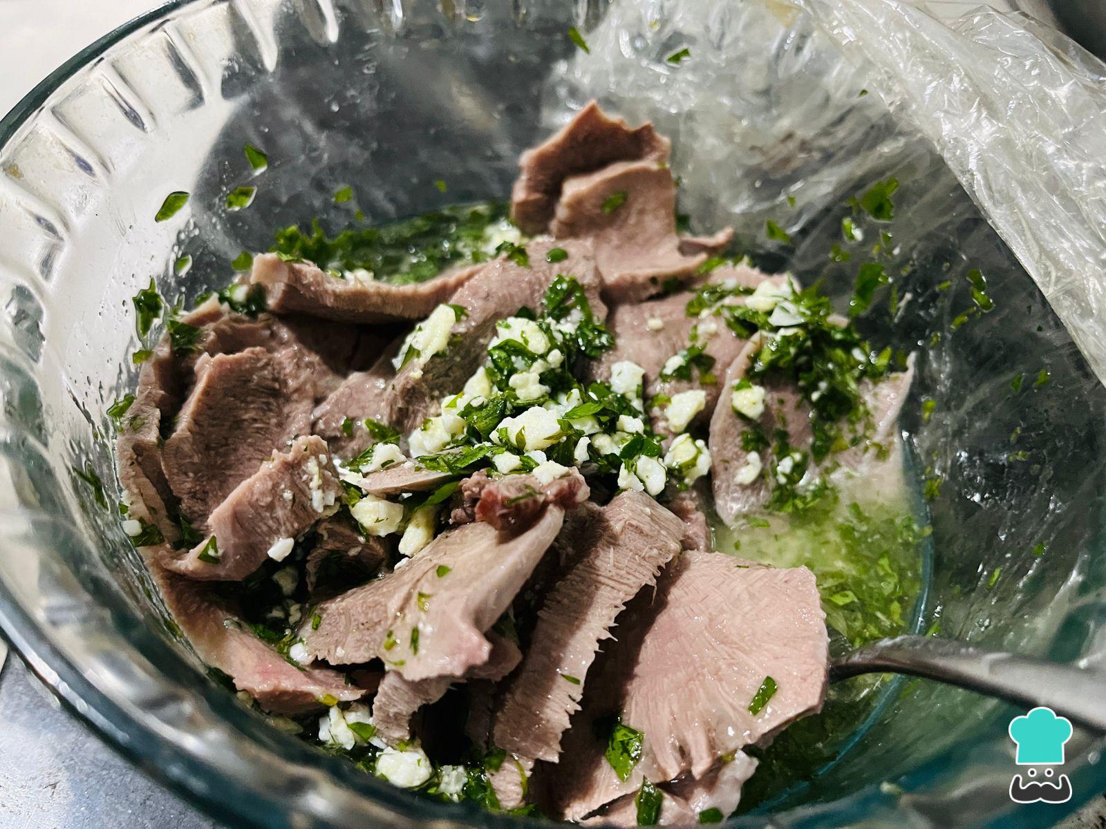 Mezcla la lengua en rodajas con la preparación de la vinagreta. Resérvala en la heladera con film y una bolsa para evitar que contamine con olor mínimo unas 4 horas.