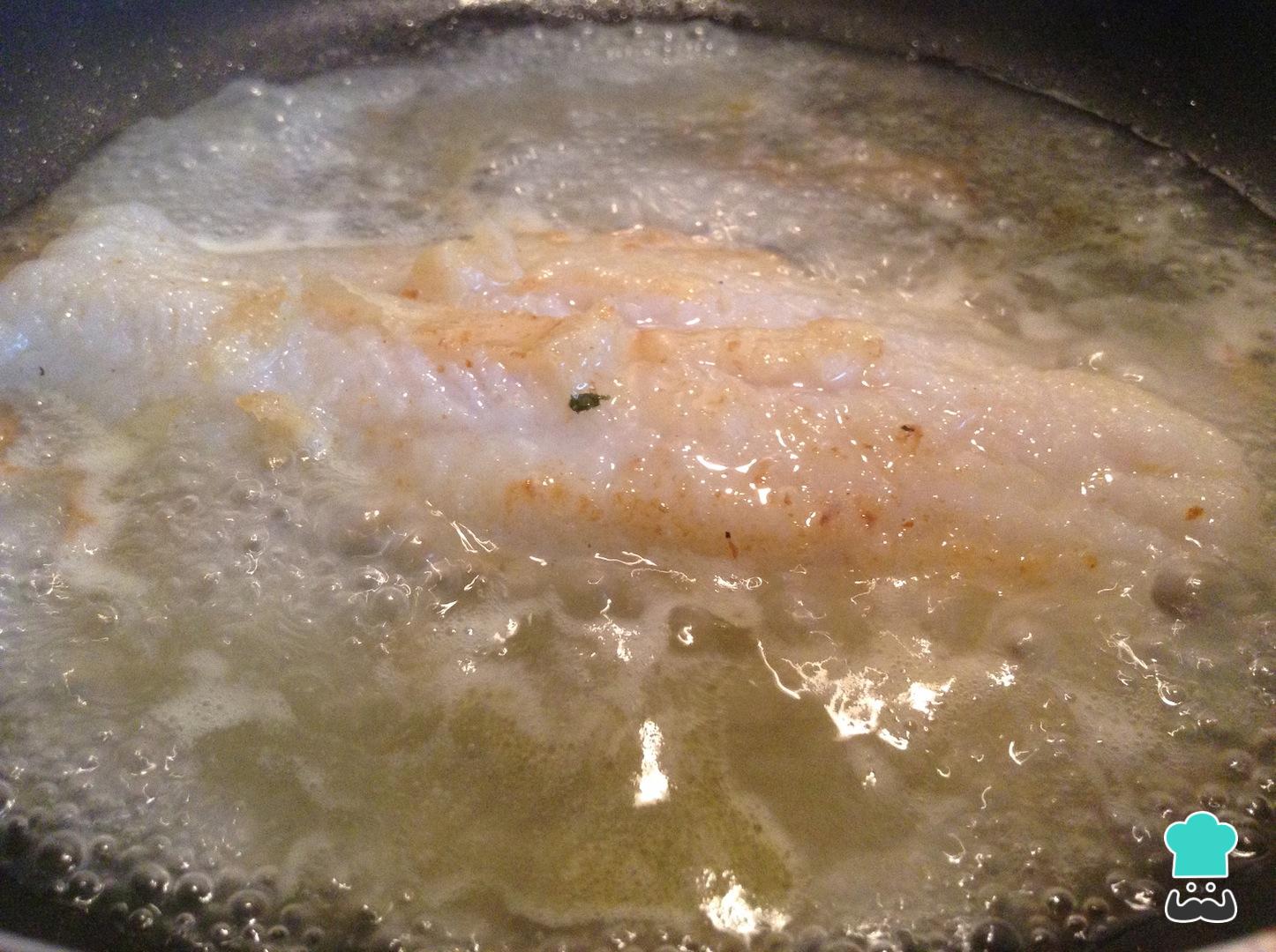 Una vez los filetes de lenguado se doren por lado y lado adiciona la salsa de naranja, previamente pasado por un colador. Deja reducir un poco más la salsa y apaga el fuego.