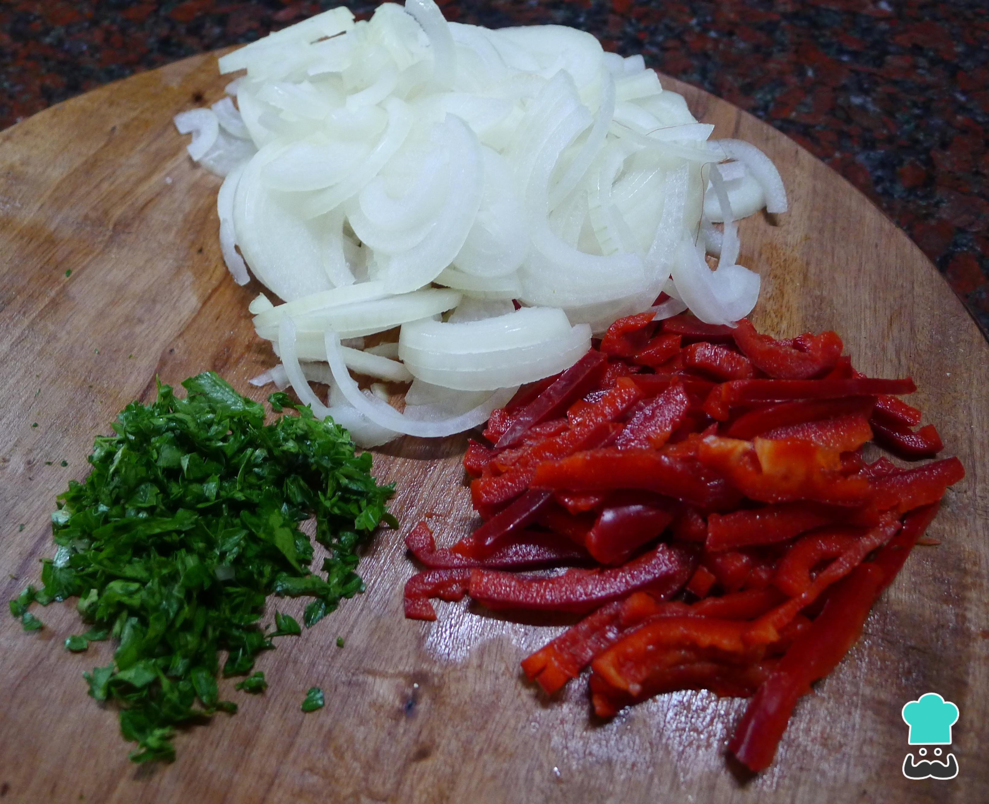 Cortar las cebollas y el pimiento en juliana. Picar finamente el perejil.