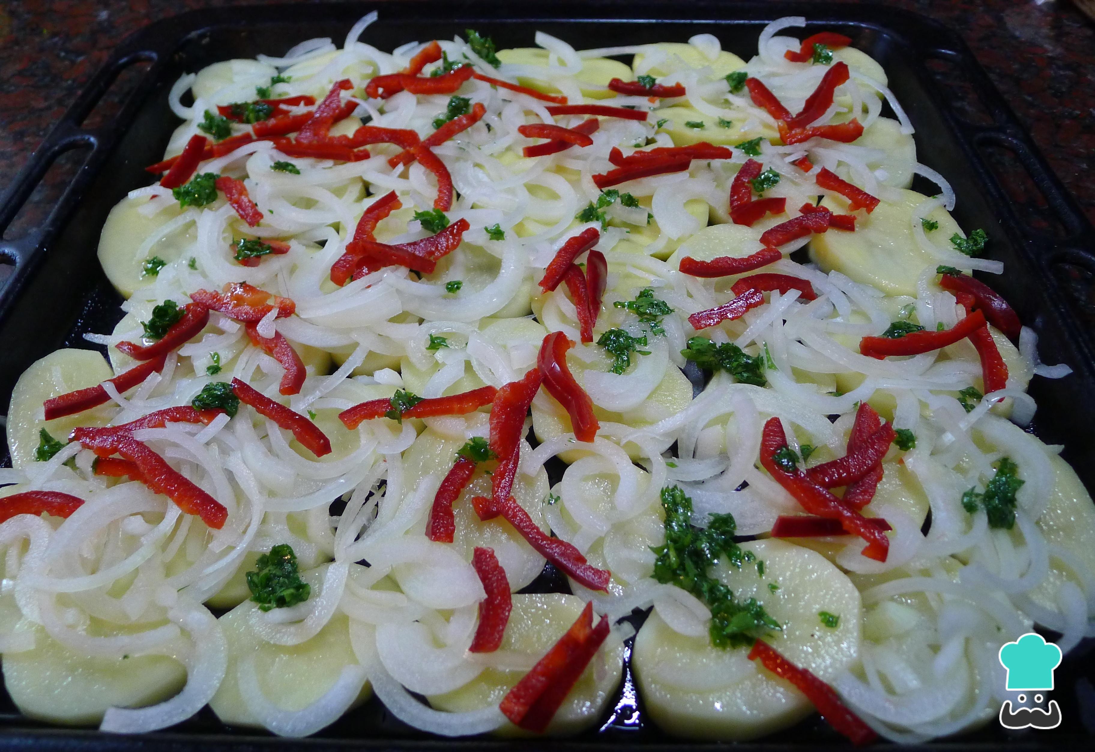 Mezclar el perejil con aceite, sal y pimienta. Colocar por encima de las patatas las cebollas, el pimiento y la mezcla del perejil. Llevar a horno fuerte hasta dorar las patatas por un lado.
