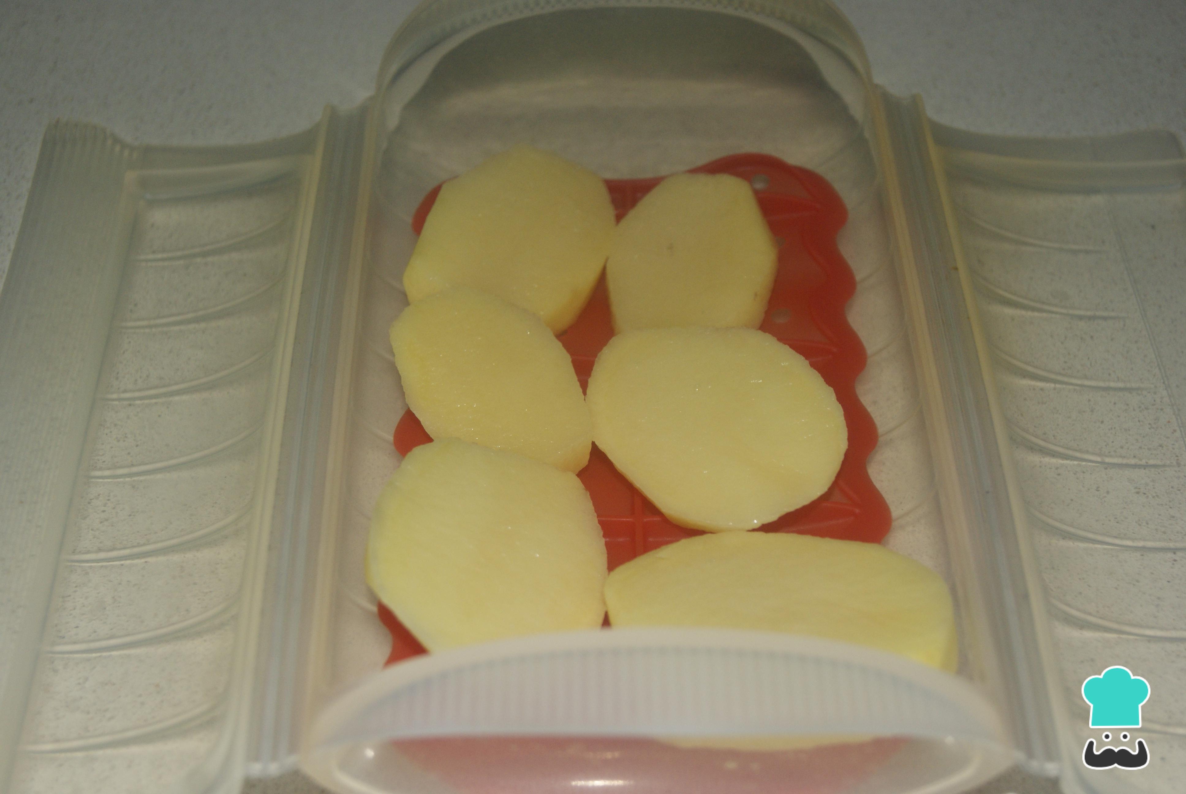 Pelamos la patatas, las cortamos en rodajas de unos dos centímetros, salamos y rociamos con un poco de aceite.
