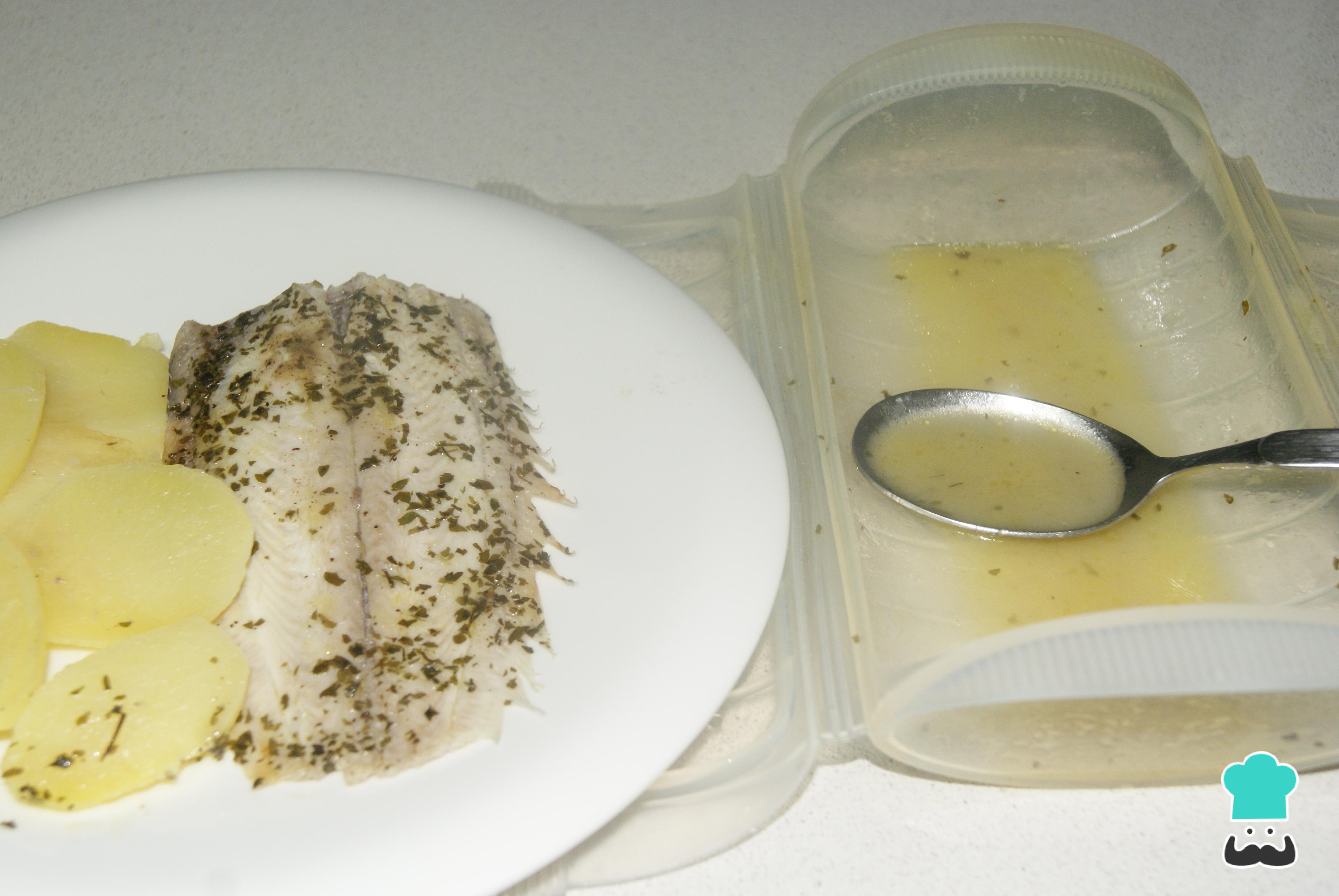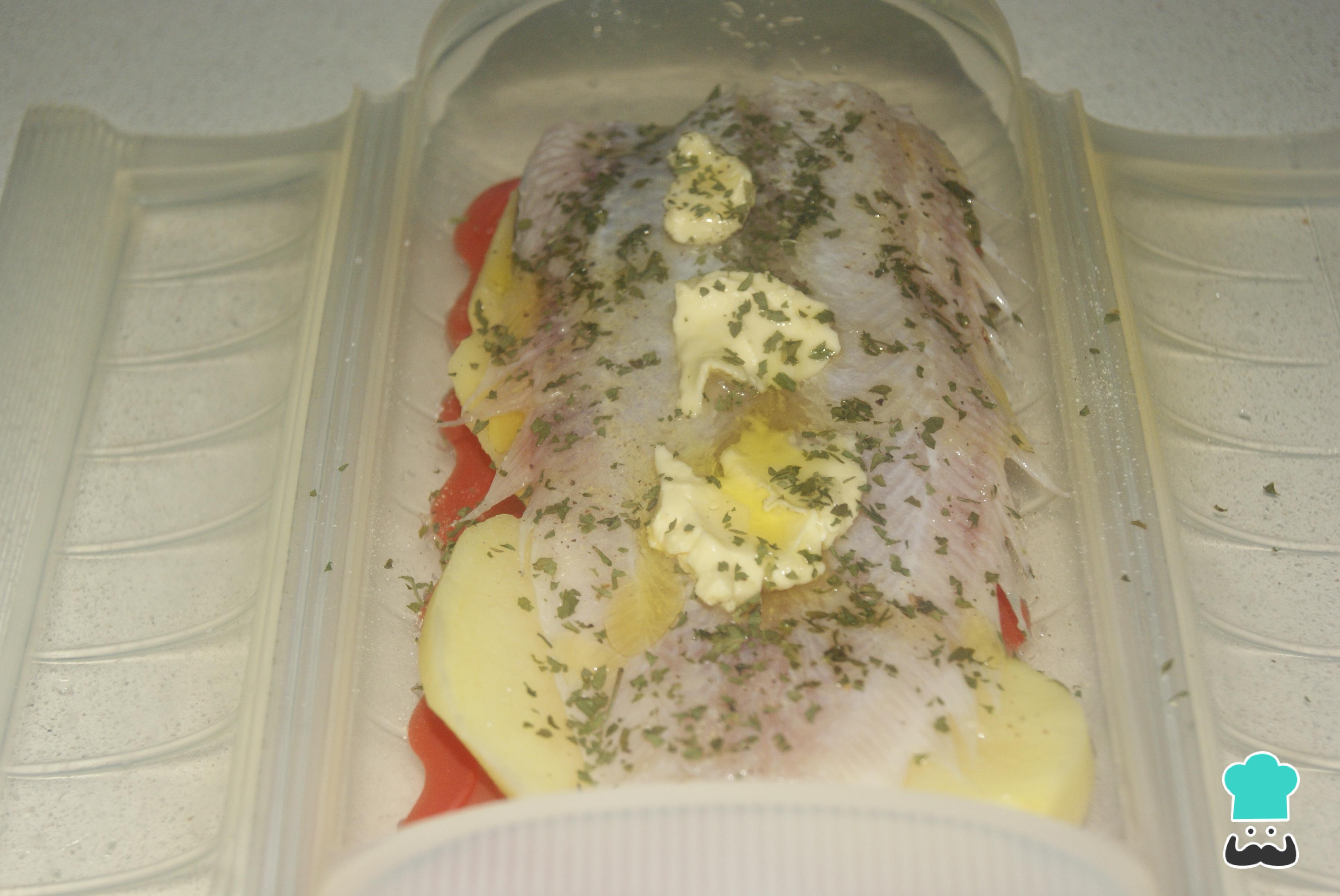 Con el limón hacemos un zumo y lo rociamos por encima del lenguado. A continuación espolvoreamos con el perejil seco, y metemos el estuche lékué al microondas durante ocho minutos a máxima potencia.