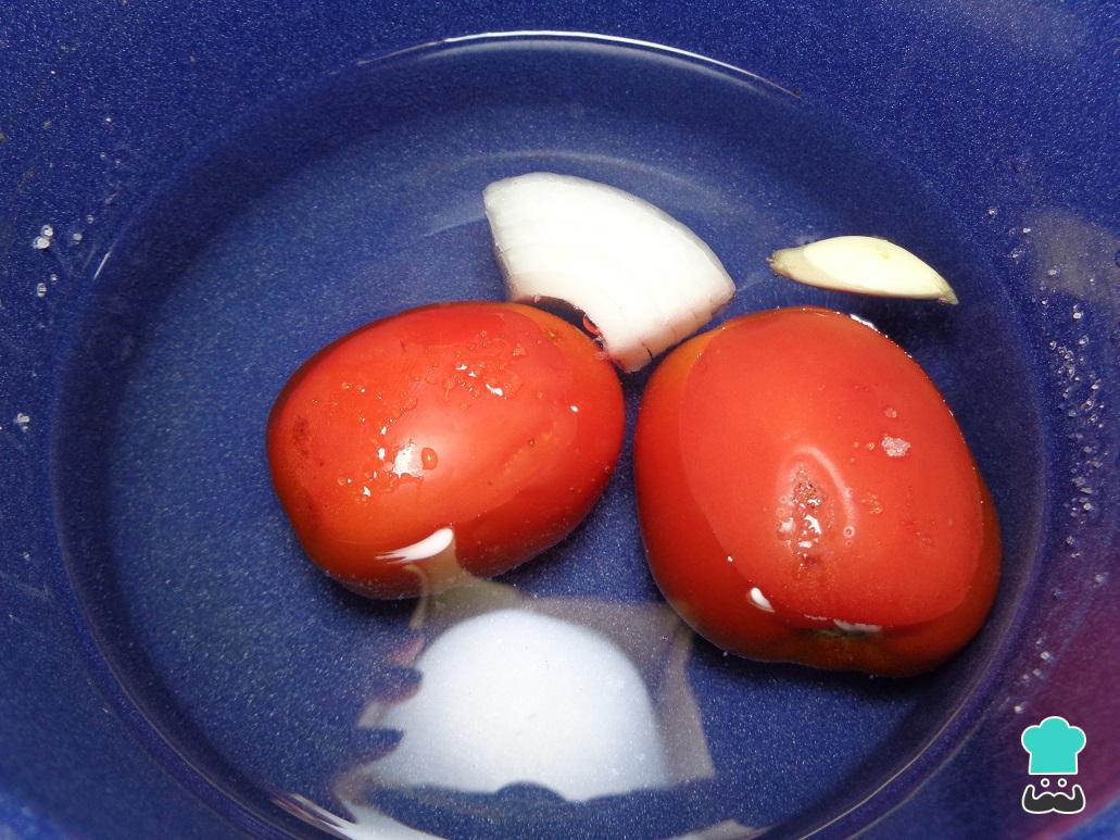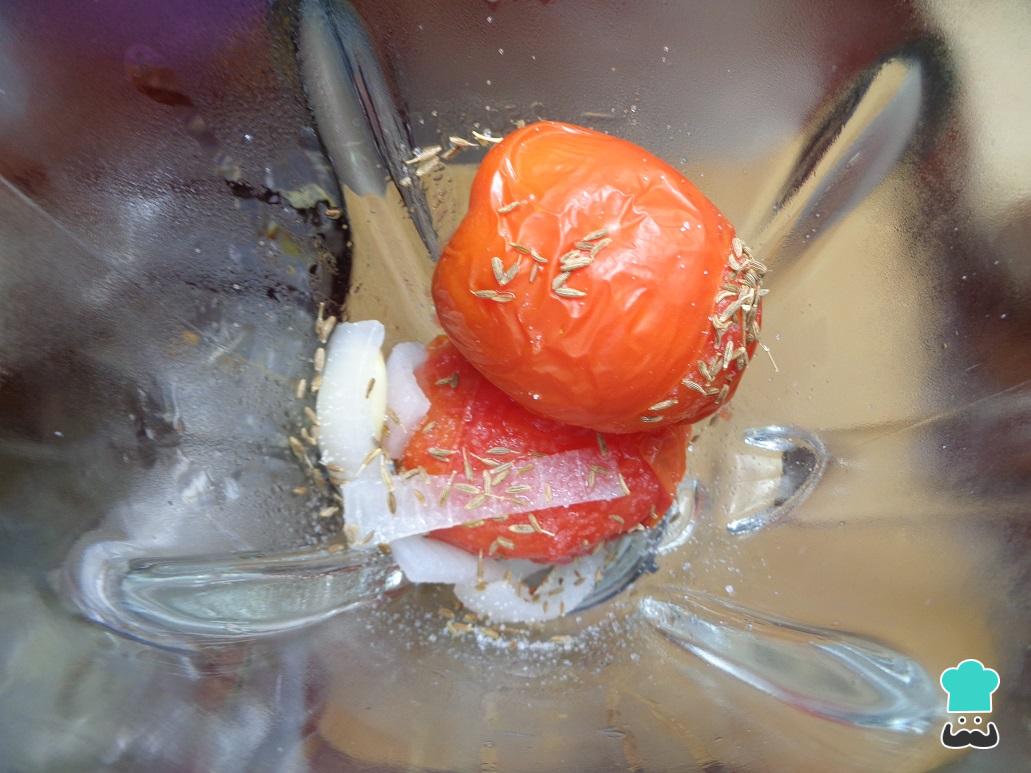 Recuperamos las verduras, y una vez listo el tomate rojo lo colocamos en la licuadora junto con la cebolla y el ajo para hacer la salsa base. Entonces añadimos la pizca de comino, 3 tazas de agua y licuamos todo hasta obtener una salsa de tomate homogénea.