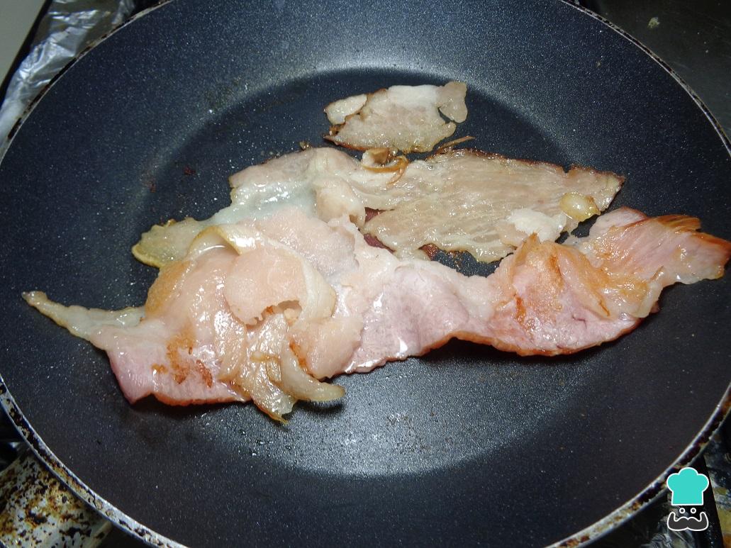 Mientras tanto, freímos el tocino en un sartén caliente, dejamos que se frían hasta que se observe dorado y ligeramente crujiente.