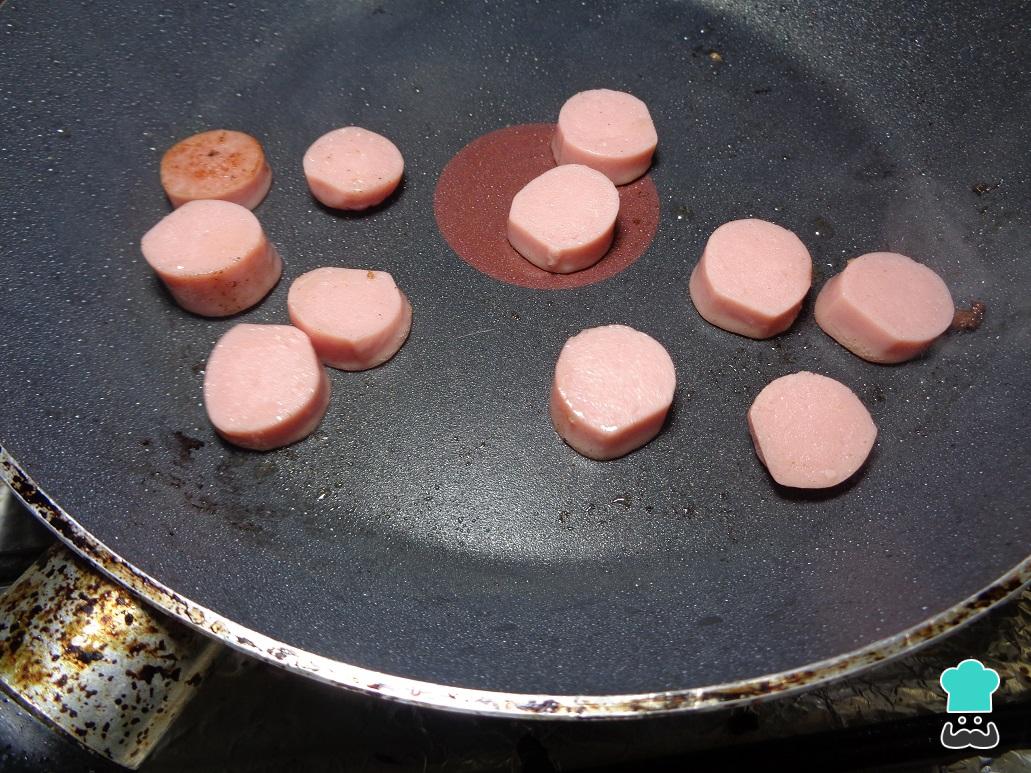Ahora, en la misma grasa que dejo el tocino, freímos las salchichas rebanadas en pequeños trozos, como los que observamos en la siguiente imagen. Dejamos que se frían hasta que estén doradas.