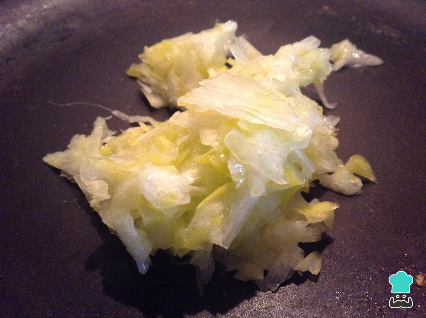 Mientras tanto, vamos a realizar la base de nuestra preparación. Para ello, corta muy fina o procesa la cebolla larga.