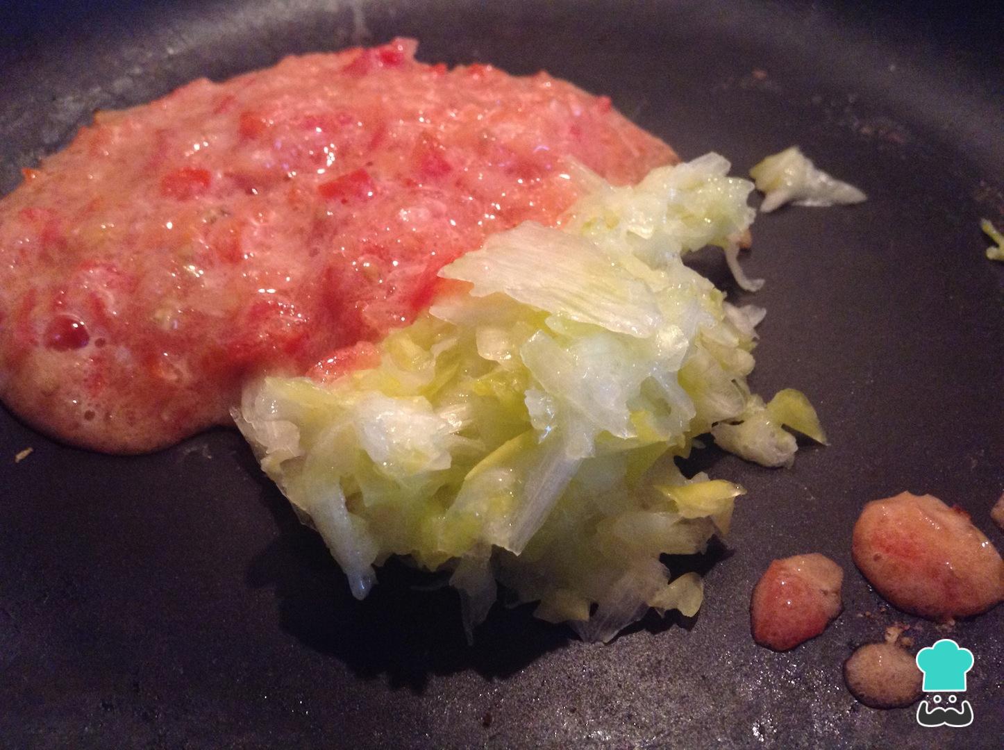 Adiciona la cebolla y el tomate triturado a una sartén y sofríe a fuego medio con un poco de aceite de girasol.