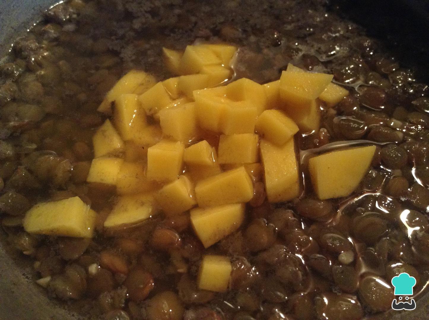 Una vez observes que las lentejas están blandas, adiciona la patata criolla en cuadros muy pequeños a la olla.