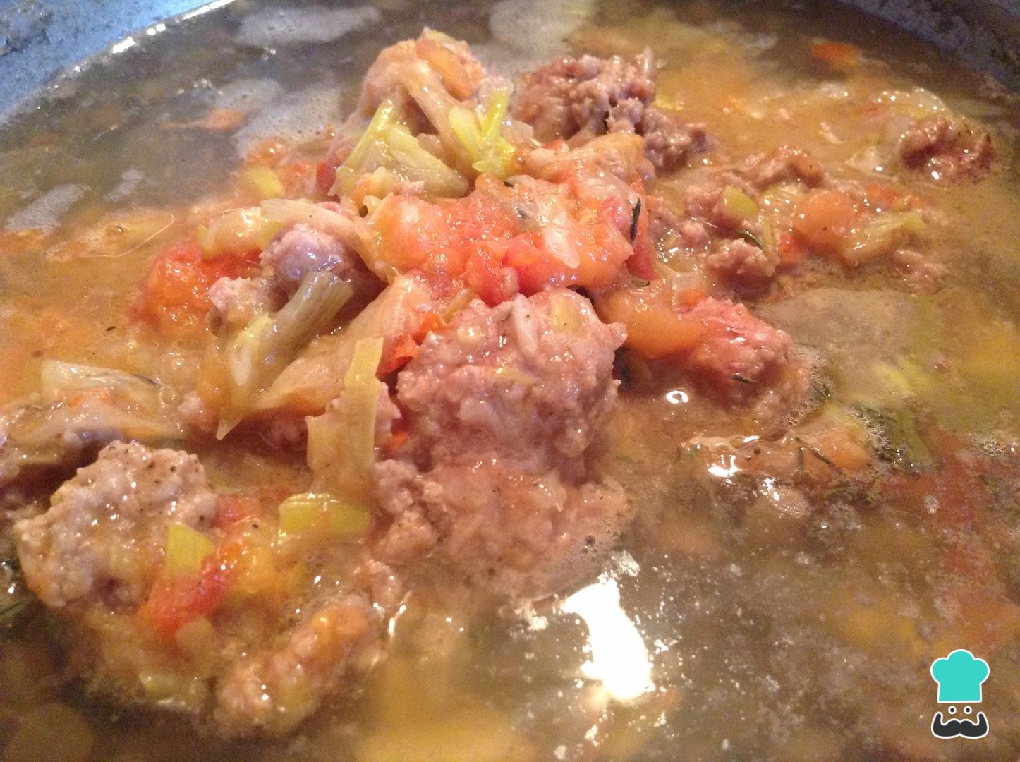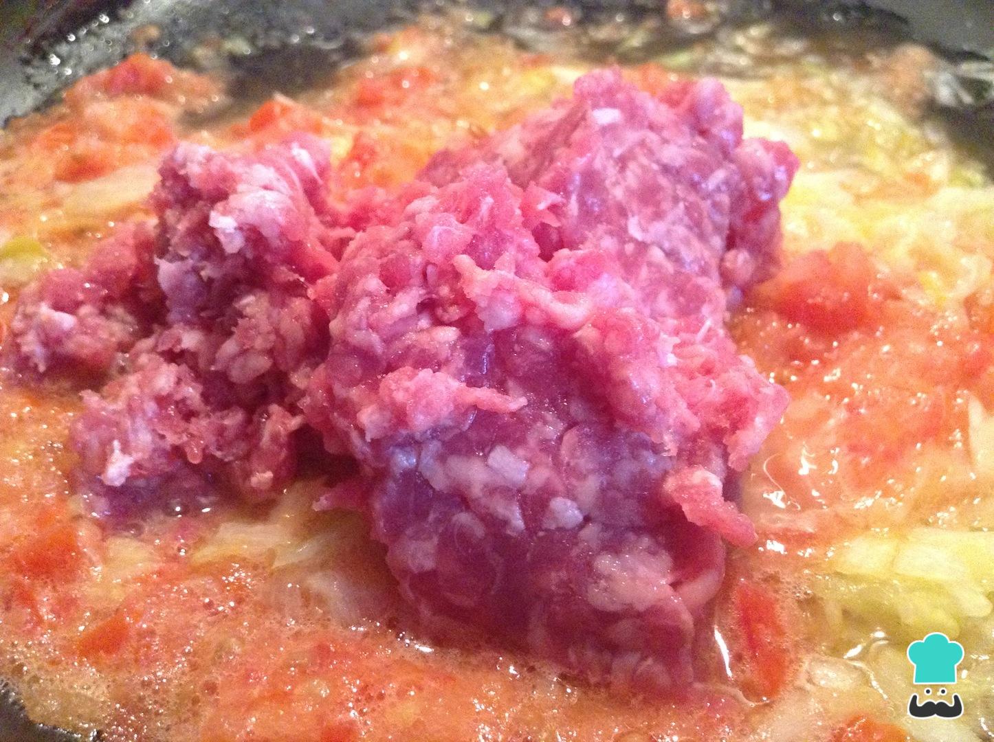 Cuando veas que el sofrito está casi listo, añade la carne molida con sal y pimienta al gusto.