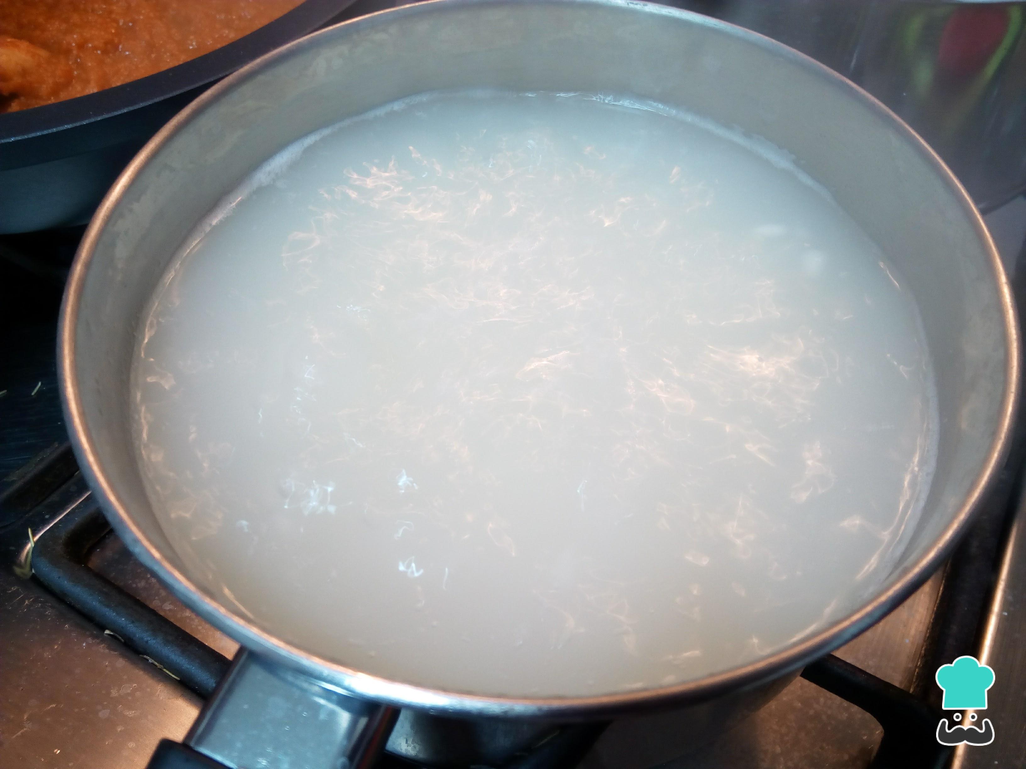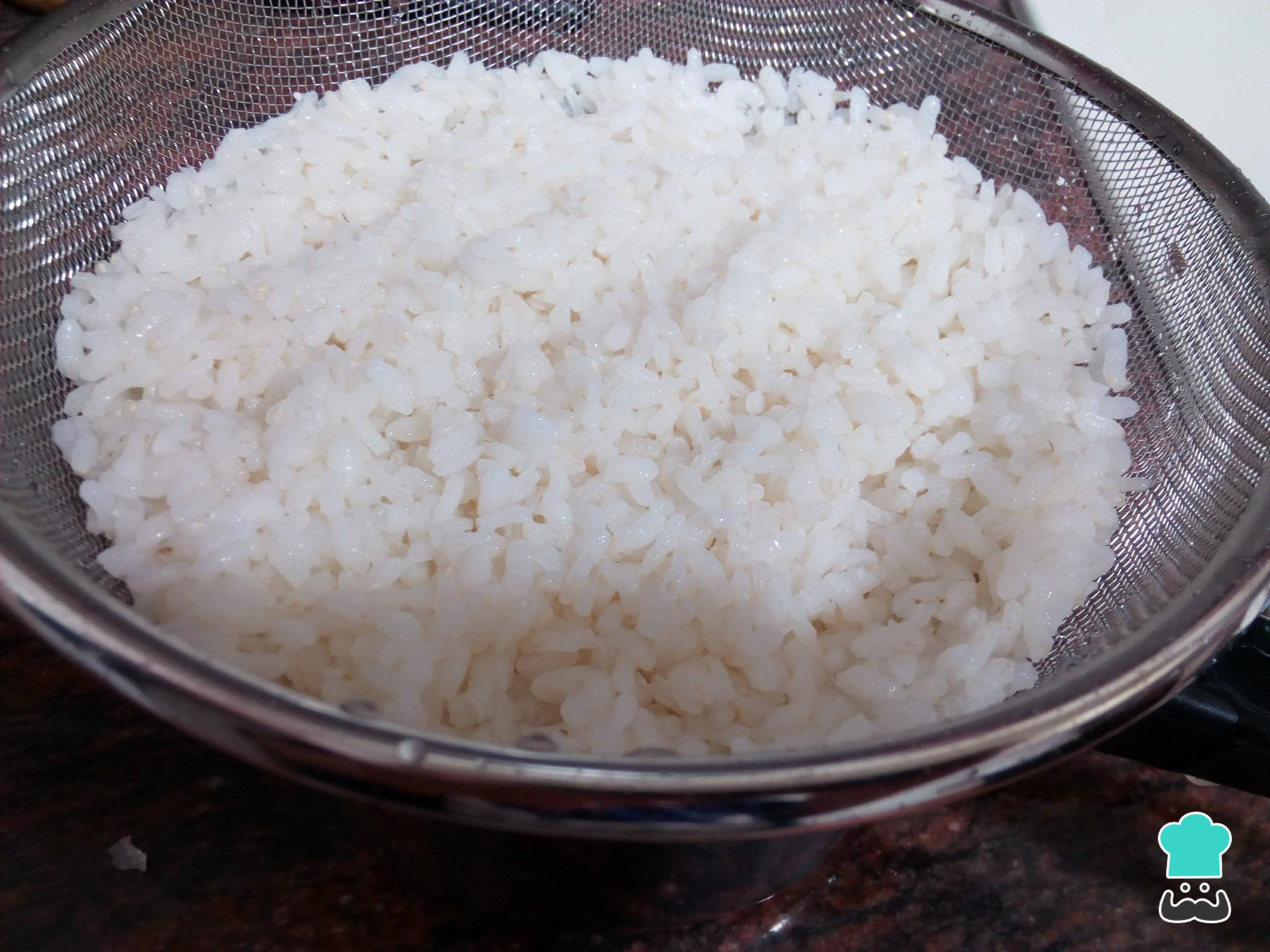 Cuando el arroz esté cocido, lo colamos, lo lavamos un poco con agua fría y lo reservamos para más tarde.